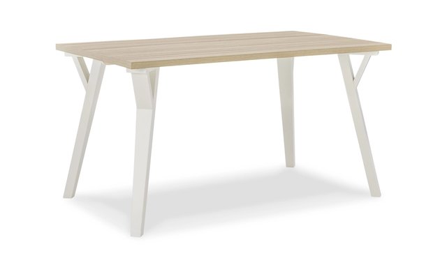 Bring light to your dining area with clean lines and a bright two-tone finish. The rectangular dining table sports stylized saber legs in a white finish for beautiful simplicity. The melamine top in a light tan color provides additional durability, marrying minimalism with big style for a delightful combination.