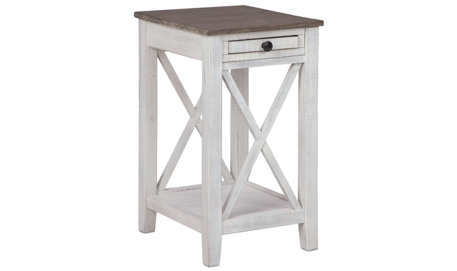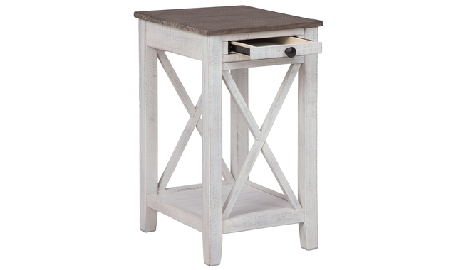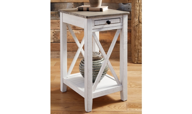Modern meets vintage in this accent table. Made of woods in a distressed white and gray finish, the crossbuck supports on two sides create a vintage vibe. With two USB charging ports, the accent table also adds modern function. The storage self and drawer make this piece a must-have for your living space.