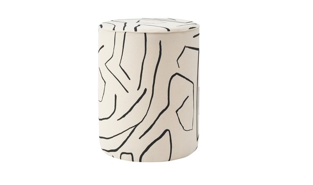 An abstract pattern emerges from the fabric to shape this stool. Finished in cream and adorned with bold black lines along its cotton surface, it has unique qualities that add a note of creativity to the home. Stool Cotton antique brass plated Printed Foam padding