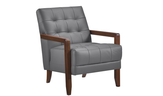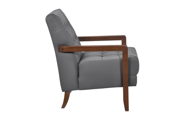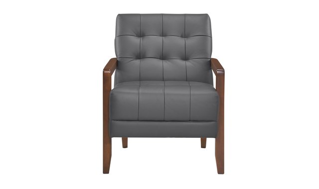 Elevate your living space with this top grain leather match accent chair, designed for timeless elegance, premium comfort, and lasting durability. Featuring a mid-century modern silhouette, deep tufted detailing, and a solid wood frame with sleek armrests, this chair blends sophisticated style with everyday functionality. The plush, high-density foam cushioning provides exceptional support, while the top grain leather match upholstery offers a luxurious look and soft, supple feel. Built with sturdy wooden legs and reinforced construction, this accent chair is perfect for living rooms, home offices, reading nooks, or bedroom seating, adding a touch of refined charm to any décor.