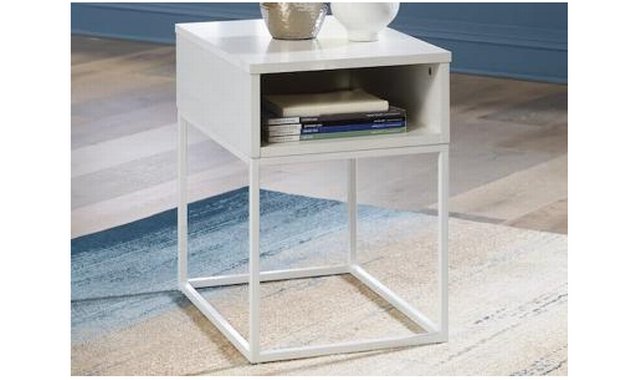 Bring your vision of a modern living room to life with this sleekly designed end table. Its linear construction and white finish keep things minimal. This piece keeps your morning coffee, reading lamp or favorite book within your reach in simply streamlined style. Made with engineered wood and decorative laminate Replicated pickled white oak wood grain Tubular metal frame with white powder coat finish Assembly required