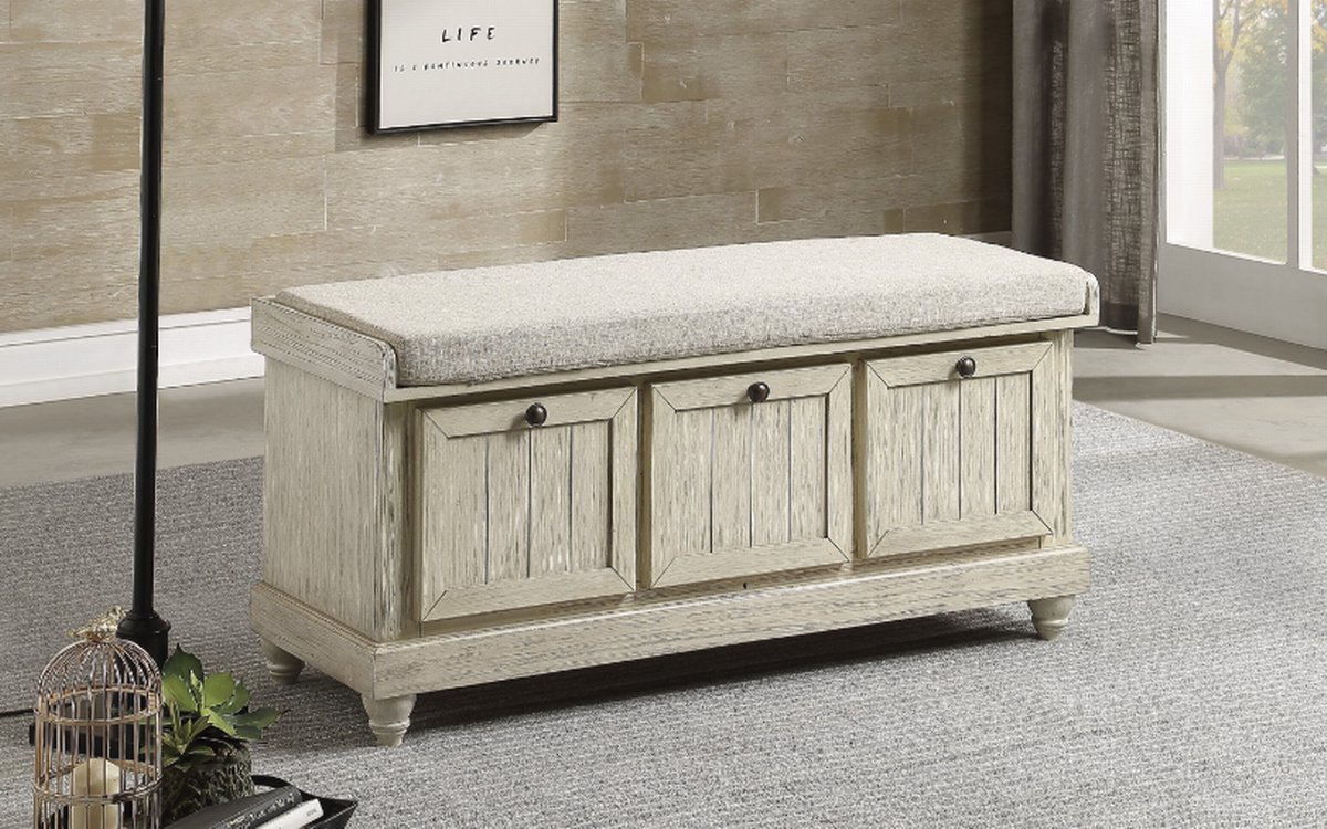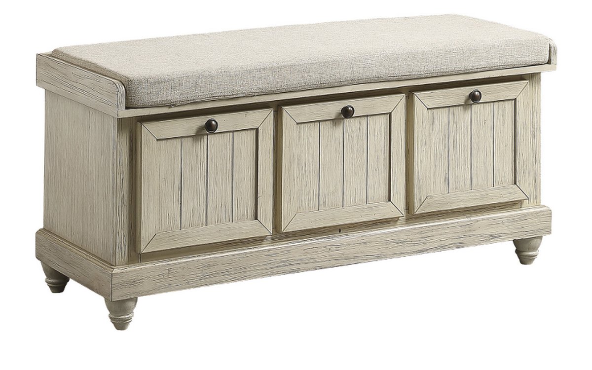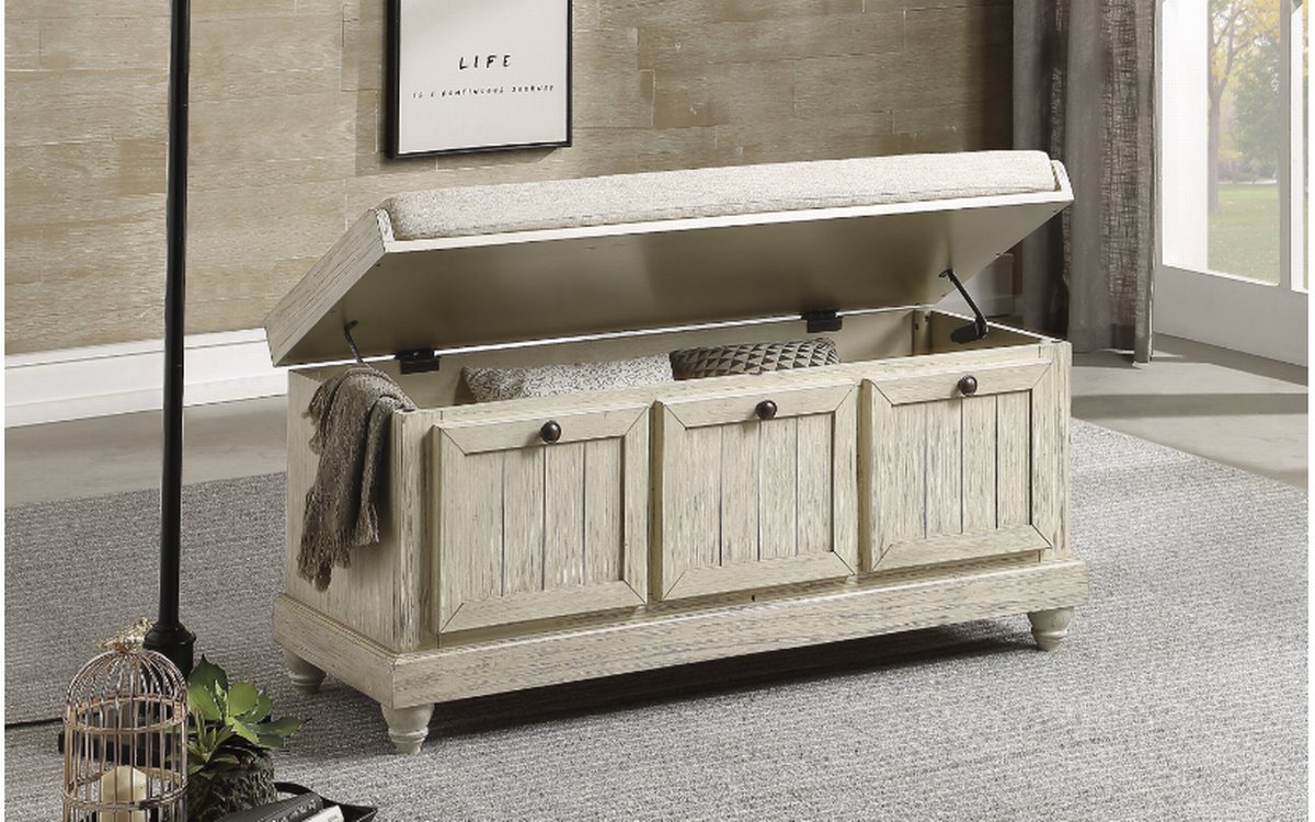 The Woodwell Collection will be a functional addition to your home. False drawer fronts serve as the base for this lift-top storage ottoman. A neutral tone beige padded seat provides a comfortable spot to sit as you prepare for your daily outings. Knob hardware creates a contrast to the antique white, with grey rub-through, finish.