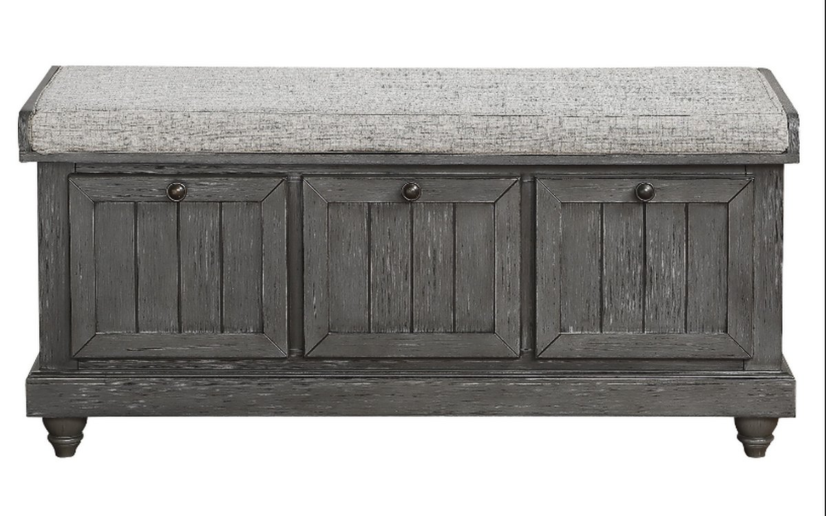 The Woodwell Collection will be a functional addition to your home. False drawer fronts serve as the base for this lift-top storage ottoman. A neutral tone beige padded seat provides a comfortable spot to sit as you prepare for your daily outings. Knob hardware creates a contrast to the antique white, with grey rub-through, finish.