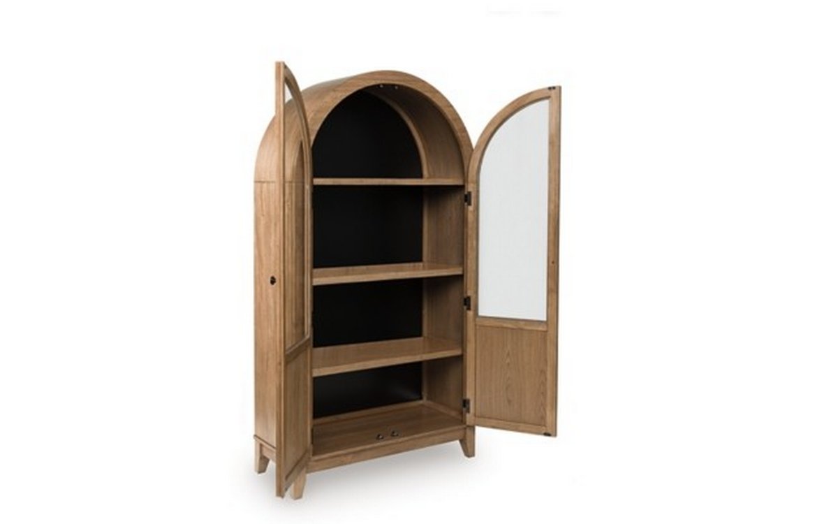 This accent cabinet is proof positive that style and storage can go hand in hand. Doors with glass fronts invite you to create a charmingly curated display of your favorite china and decor pieces. And the cool curves of its arched design add an inviting aura that's welcome in all casual spaces, from modern farmhouse to coastal. Made with wood, oak veneer and engineered wood naturel and black finishes Wood door pulls in white finish Glass panel door fronts Double door cabinet 3 shelves (2 fixed and 1 adjustable)