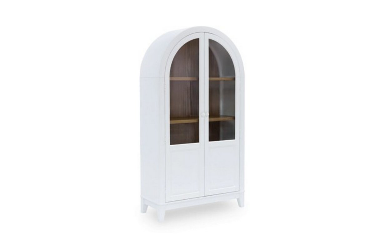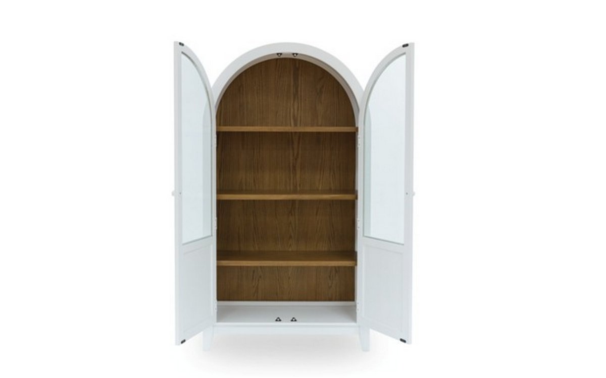 This accent cabinet is proof positive that style and storage can go hand in hand. Doors with glass fronts invite you to create a charmingly curated display of your favorite china and decor pieces. And the cool curves of its arched design add an inviting aura that's welcome in all casual spaces, from modern farmhouse to coastal. Made with wood, oak veneer and engineered wood white and natural brown finishes Wood door pulls in white finish Glass panel door fronts Double door cabinet 3 shelves (2 fixed and 1 adjustable)