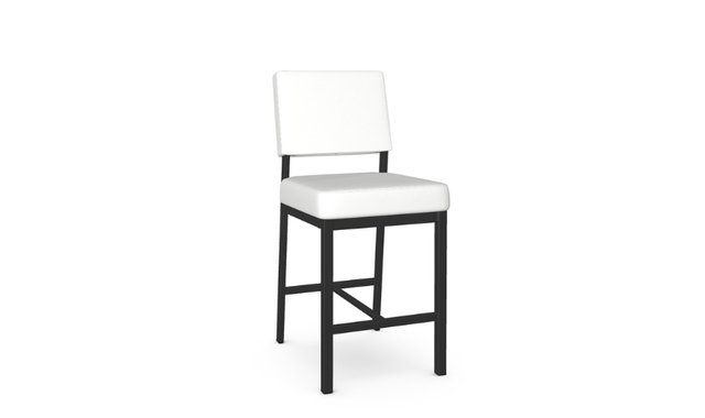 Counter-height stool from Amisco. Mathilde non-swivel model. Metal Structure Color: 25 Black corail. Seat and backrest upholstered in DH blizzard color in polyurethane.