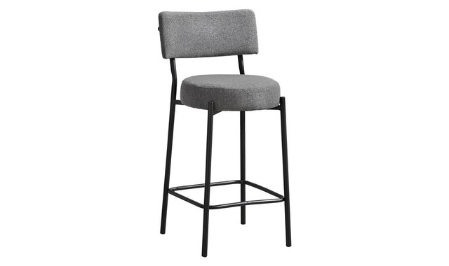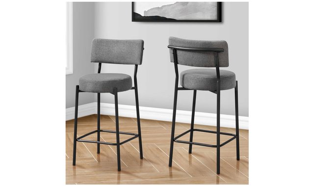 Add some contemporary flare to your kitchen with this trendy set of 2 counter height barstool chairs. Upholstered in durable grey fabric with a slim solid frame of sturdy black metal legs, these fashionable style barstools are the perfect addition to your modern home decor. The curved padded backrest and thick, round cushioned foam seat provide maximum comfort, while the footrest adds extra support. Easy to assemble with illustrated instructions included and built with sturdy construction, these barstools include a 2 year limited warranty against any defects for years of enjoyment. Pair this comfortable barstool set with a counter height table (sold separately) to transform your space into a chic and inviting area for yourself and your guests.