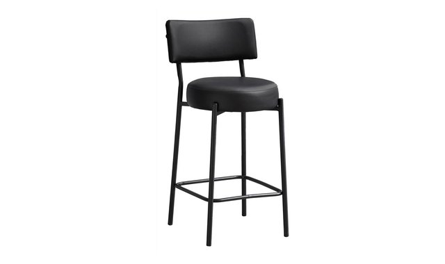 Add some contemporary flare to your kitchen with this trendy set of 2 counter height barstool chairs. Upholstered in durable black leather look with a slim solid frame of sturdy black metal legs, these fashionable style barstools are the perfect addition to your modern home decor. The curved padded backrest and thick, round cushioned foam seat provide maximum comfort, while the footrest adds extra support. Easy to assemble with illustrated instructions included and built with sturdy construction, these barstools include a 2 year limited warranty against any defects for years of enjoyment. Pair this comfortable barstool set with a counter height table (sold separately) to transform your space into a chic and inviting area for yourself and your guests.