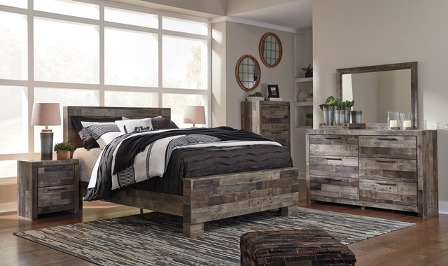 6-pc bedroom set. Modern yet hefty. This queen (60 in.) panel bed makes an urban eclectic statement. Seasoned raw wood look merges with the clean lined design we love today. Muted rustic finish over replicated pine grain maintains its authenticity for a beauteous look.