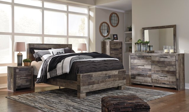 5-pc bedroom set. Modern yet hefty. This queen (60 in.) panel bed makes an urban eclectic statement. Seasoned raw wood look merges with the clean lined design we love today. Muted rustic finish over replicated pine grain maintains its authenticity for a beauteous look.