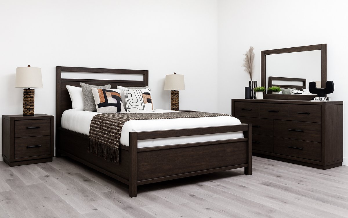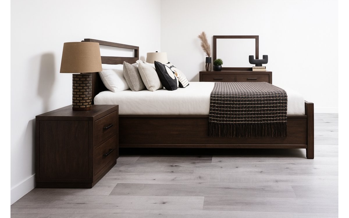 Discover the Vista collection by Mako solid pine, Canadian-made, and contemporary in design. Elevate your bedroom with its sleek style and natural beauty. Bedroom set including double dresser, mirror, queen bed and 1 nightstand