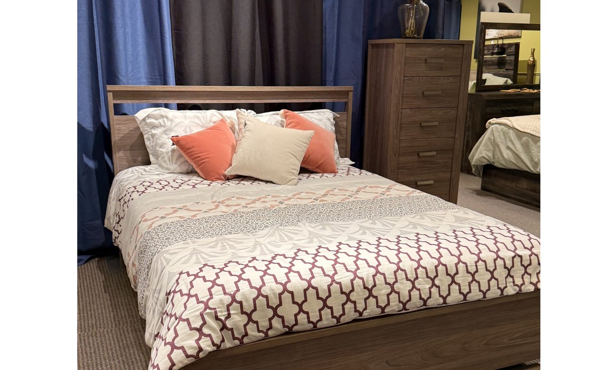 Ashley queen-size melamine complete bed with 5-drawer chest.