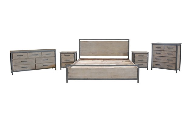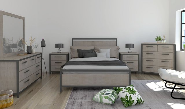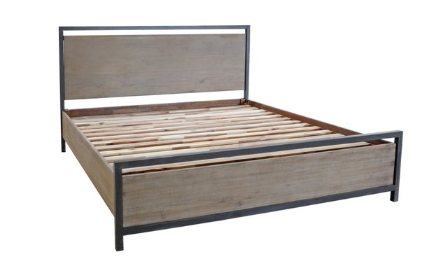 Black Iron Frame Solid Acacia Wood: Siderails, Footboard, Slats MDF Acacia Veneer: Headboard Metal: Outer Frame, Hardware