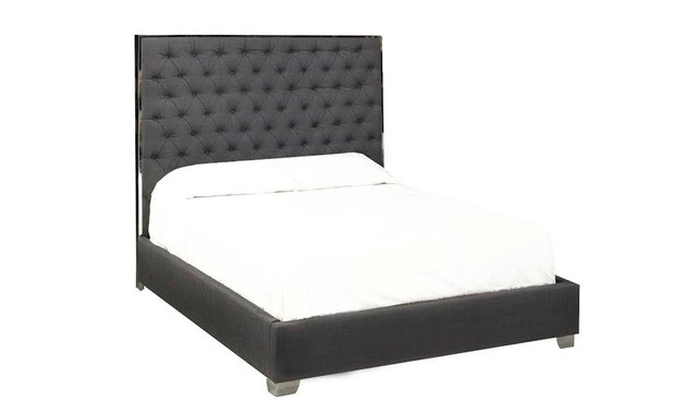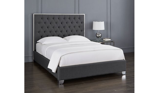 Polished stainless steel frame and accents provides a chic accent. The bed has grey inset tufted upholstery panel. Prepare to relax in glamorous style. This bed will deliver sophistication, elegance, and comfort every single n