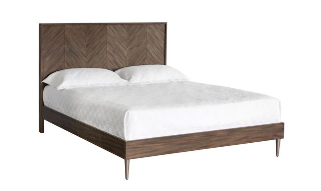 This bed from our Zenn collection will bring character and warmth to any bedroom space. Made of smoked acacia wood with a stylish handcrafted chevron pattern on the headboard. Brass nickel metal feet complete the look. No box spring is required and folding slats are included.