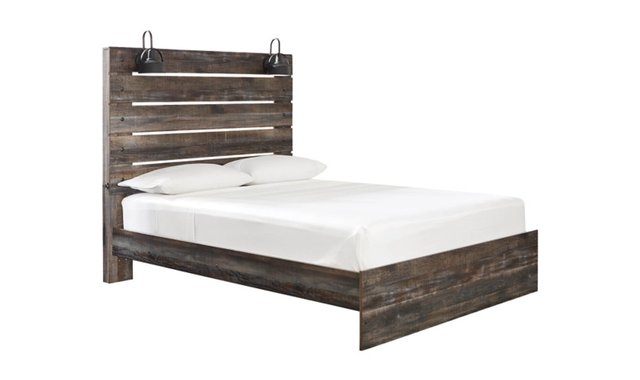 When merged in just the right way, rustic and industrial styles can make one happy marriage. Case in point: this queen panel bed. A refined take on barn board beauty, its complex, replicated wood grain showcases hints of burnt orange and teal tones for a sense of weatherworn authenticity. Love to read in bed? You’re sure to find the pair of retro-chic light sconces and USB plug-ins on the open-slat style headboard such a bright idea. Mattress and foundation/box spring available, sold separately.