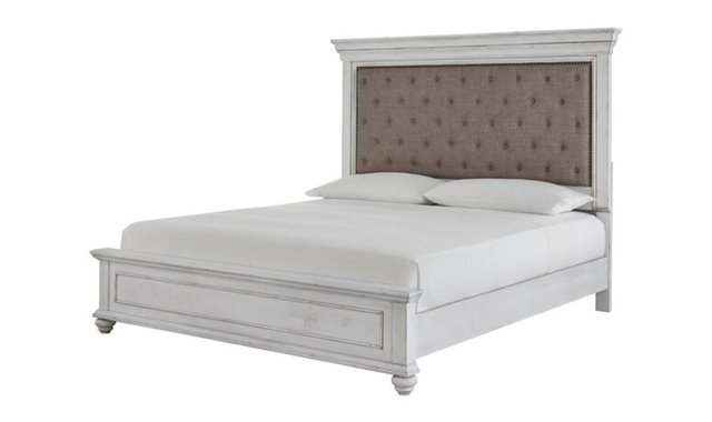 Give your retreat vintage charm with this queen upholstered panel bed. In a beautifully distressed white-washed finish, you'll love the headboard's grand style featuring an inset button tufted upholstery cushion. Generously scaled moulding from top to bottom, along with bun feet and nailhead trim give this bed character—evoking the feel of a quaint cottage escape.
