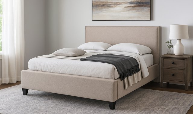 Beaudoin's Jane upholstered bed base embodies elegant simplicity. With its sleek styling and soft upholstery, Jane is the essence of modern comfort. The minimalist rectangular frame is fully upholstered, offering a warm, welcoming look. Its high, padded backrest creates comfortable support, perfect for relaxing while reading or watching TV. Available in a neutral tone, this bed base blends perfectly with a variety of decorating styles while adding a contemporary, soothing touch to the bedroom.