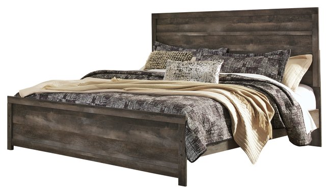 Complete bed, included: • headboard • footboard and bed rails • Modern rustic style • Gray finish over replicated oak grain