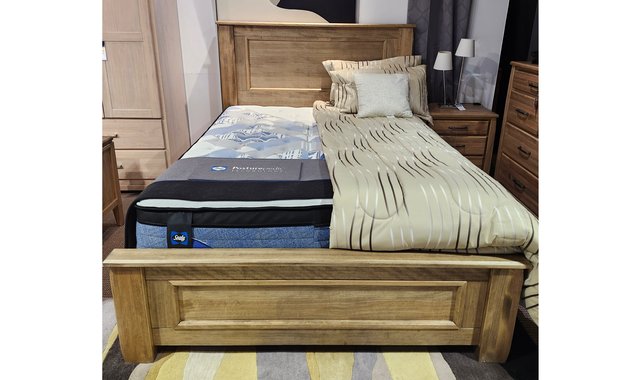 Made of pine wood. Headborad, footboard and rails for queen size bed. This bed requires a box spring.