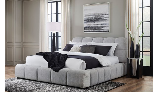 A divine merger of casual and contemporary design, this queen upholstered bed is the upgrade you've been dreaming of. Plush, deep pillowed tufting creates an impressive silhouette that's just as comfortable as it is stylish. And the textured light gray Next-Gen Nuvella™ performance fabric is soft and easy to clean. Now there's a bed with staying power.