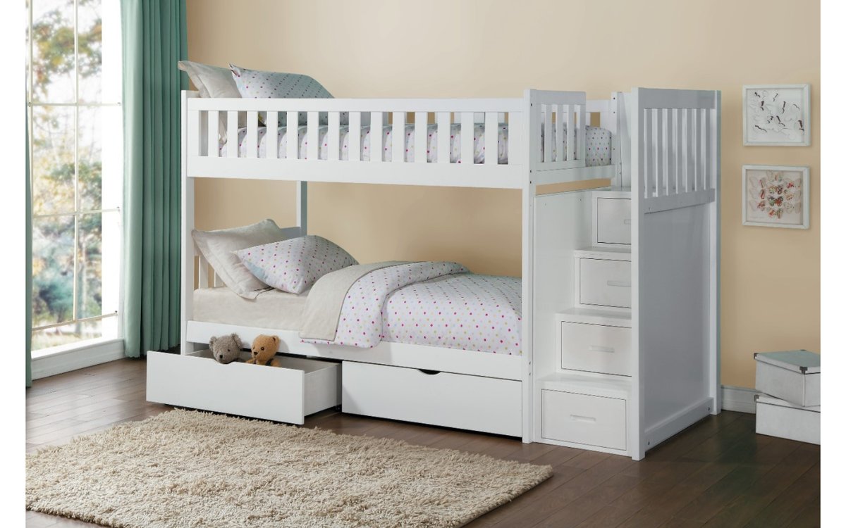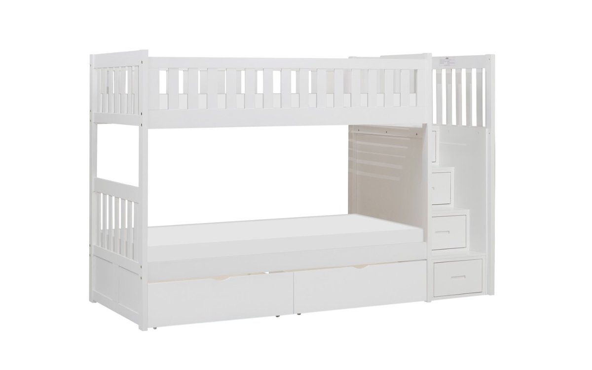 Maximizing sleep space is achieved with the stylish Galen Collection. This transitional twin over twin reversible storage stairstep bunkbed is featured in a white finish making it an appropriate choice for a number of youth bedroom settings.