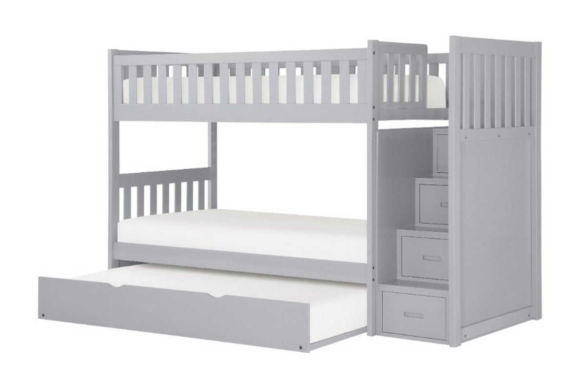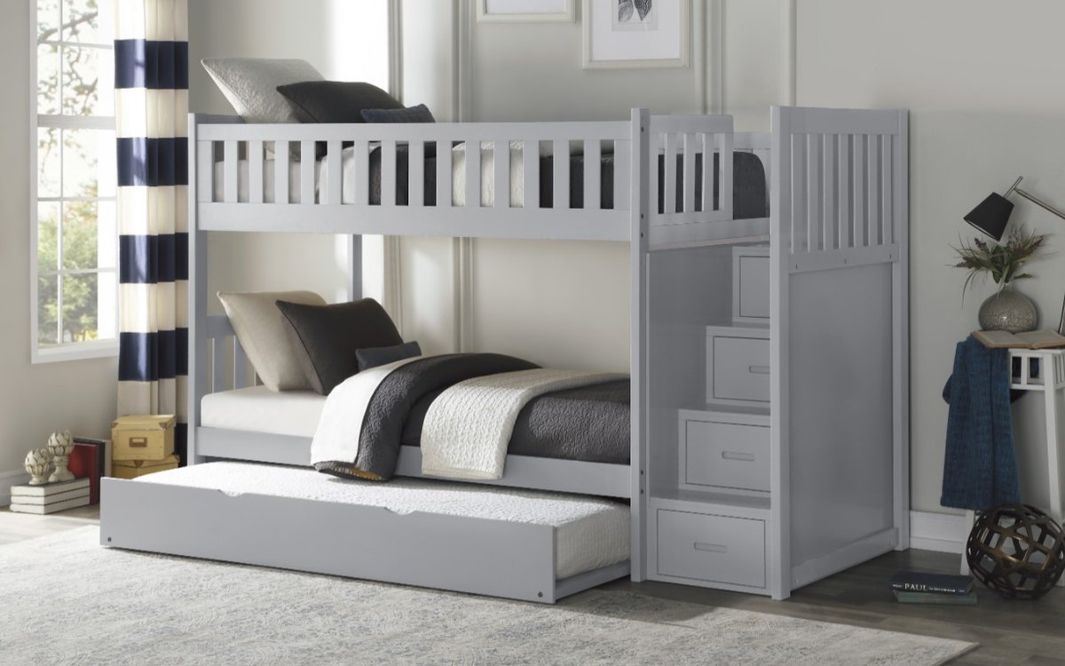 Maximizing sleep space is achieved with the stylish Orion Collection. This transitional twin over twin reversible storage stairstep bunkbed is featured in a gray finish making it an appropriate choice for a number of youth bedroom settings.