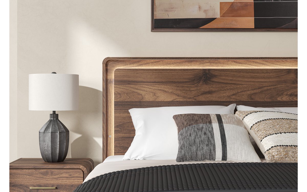 Grace your restful retreat with an added dose of refinement. This collection showcases a stunning rich brown wood tone, with sleek drawer pulls for an added layer of luxury. A rounded top softens the silhouette, elevating the look. It’s curated, contemporary and utterly chic. Made with MDF substrates and decorative paper laminate Replicated walnut wood grain with high-low contrast for a rich brown wood tone Hardware with black finish Smooth-gliding drawers with English dovetail construction and center mount drawer guides Drawer interiors lined with decorative wood grain paper laminate