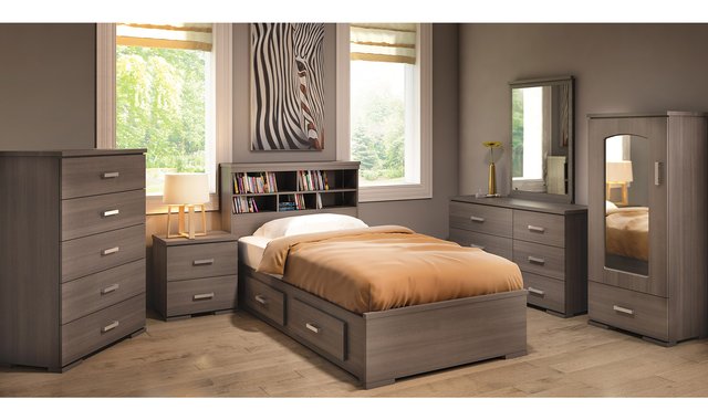 Complete single bed (39 in.). Melamine finish in charcoal color. Also available in double size (54 in.). Mattress not included.