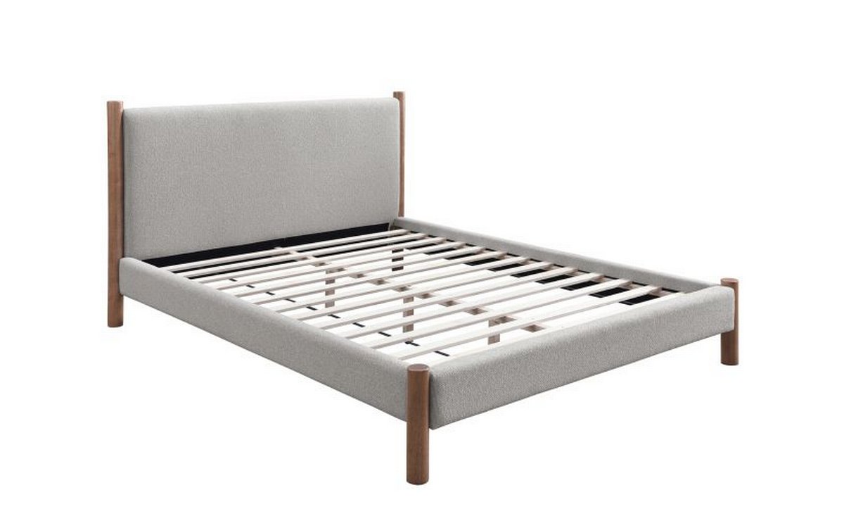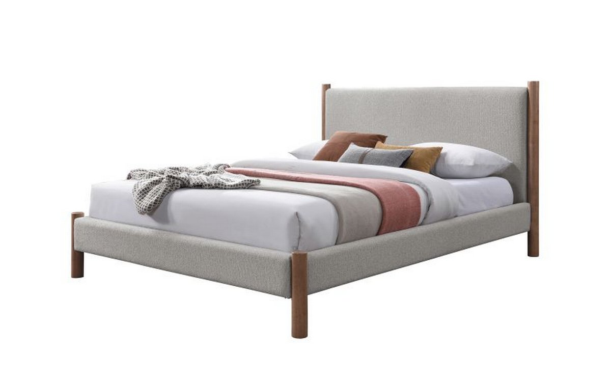 Mid-century style doing what it does best with this timeless bed. The solid wood posts are finished in a warm walnut. The two-toned mushroom colour of the texture fabric will work well with various décor themes and colours. Great for a primary bedroom or guest room, or at the cottage.