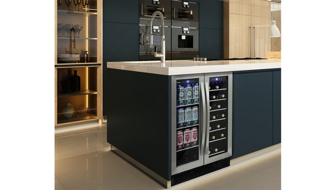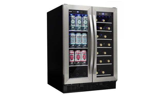 ***LIQUIDATION DÉMONSTRATEUR*** 5.2 cu. ft. beverage center stores up to 60 beverage cans (12 oz /355 ml) or 27 (750 ml) bottles of wine.French Door design: provides separate temperature controlled compartments for wine and beveragesSuperior Fan Forced Cooling: Maintains an optimal and consistent internal temperature throughout the unitTemperature range: can be set between 41°F – 64°F (5°C -18°C) for the wine compartment and 37°F – 64°F (3°C -18°C) for the beverage compartmentTemperature memory reverts to last set temperature after a power failureLED Interior Lighting: Illuminates the contents without using significant amounts of energyDigital thermostat with blue LED displayStainless steel door frame with dual pane glass and matching handle12-month warranty on parts and labor with in-home service