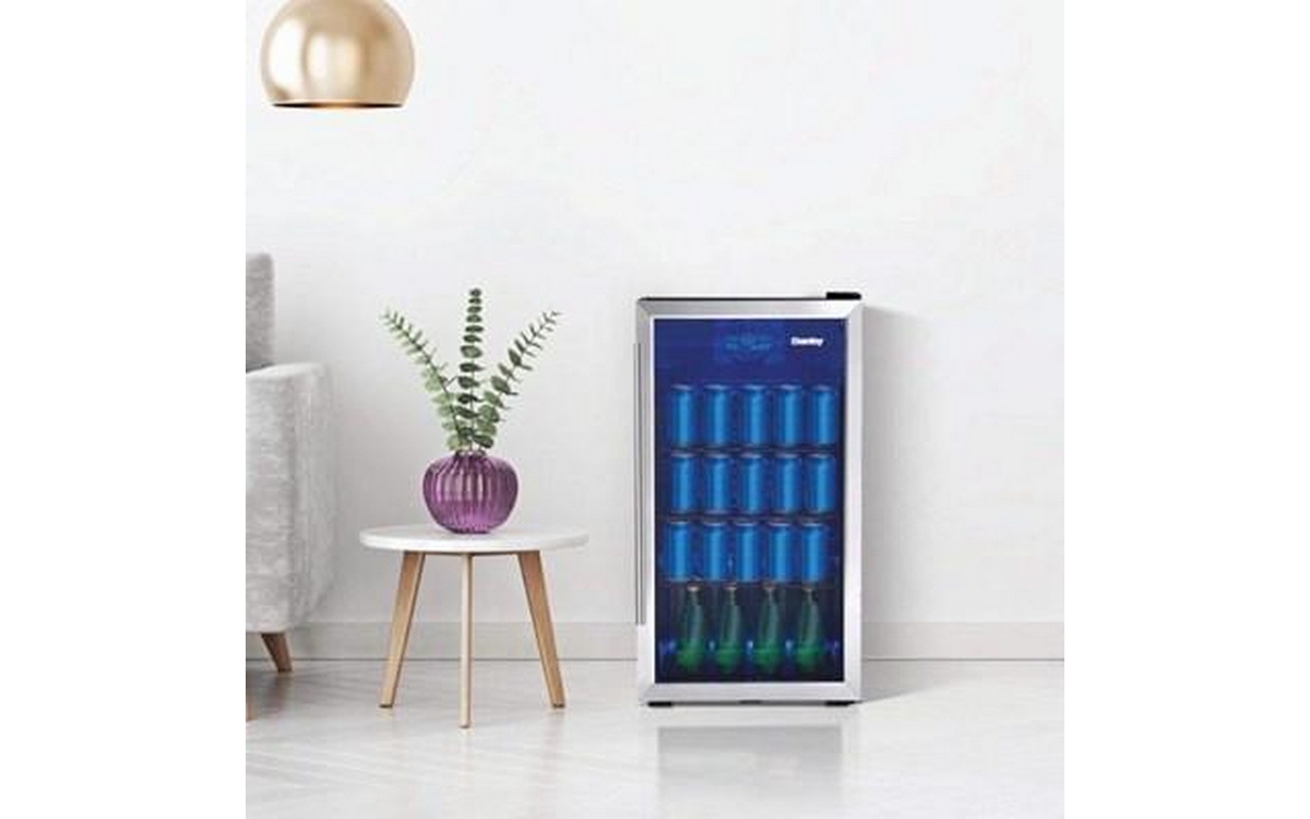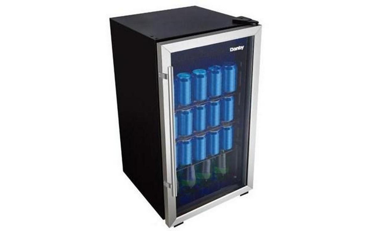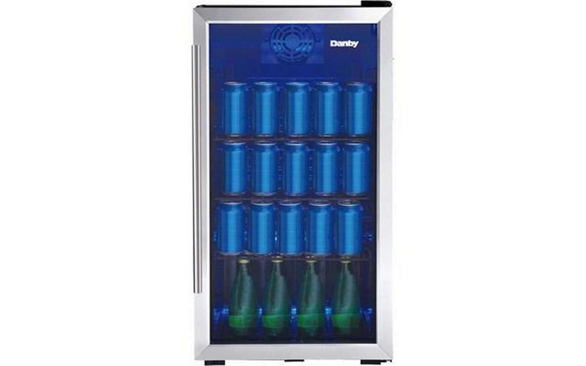 Danby Designer freestanding beverage fridge is a 3.1 cu ft. mini-fridge, designed to store beer, pop and a variety of other drinks. This unit is a convenient yet modern option for anyone looking to enhance their hosting space. Whether you're updating your wet-bar or adding extra drink storage to your basement, this Danby beverage cooler offers compact versatility with its adjustable wired shelves and blue LED lights. The smooth back design allows for flush installation near a wall, and the reversible door hinge allows you to adjust for either left or right-handed door opening. Additionally, this unit features an easy to use mechanical thermostat, with a temperature range of 2 to 10 C (35.6F 50F). With its sharp clean lines, this mini bar fridge is designed to blend with any decor style seamlessly.