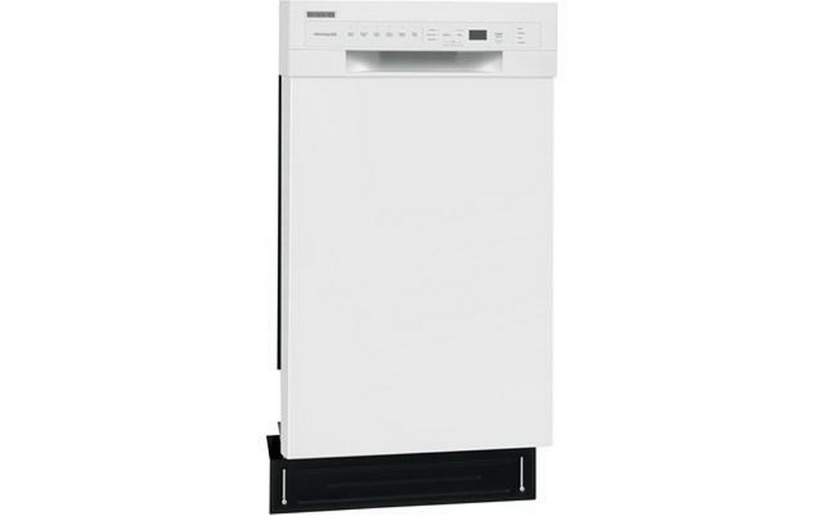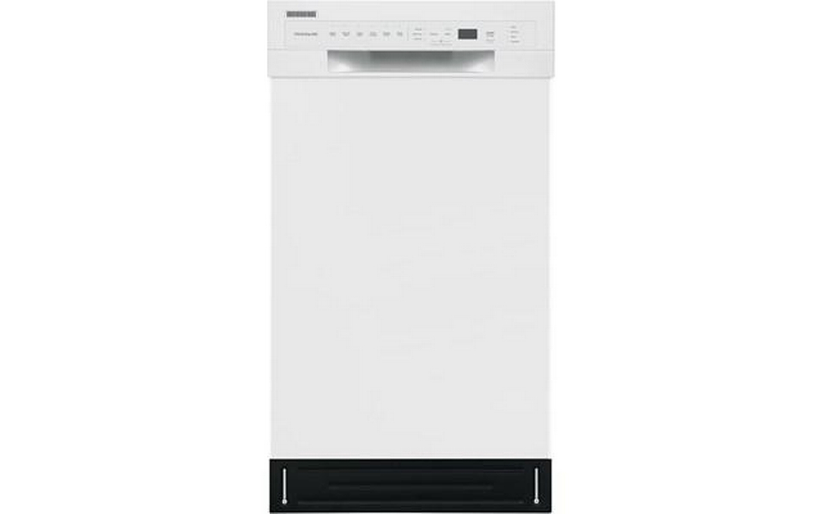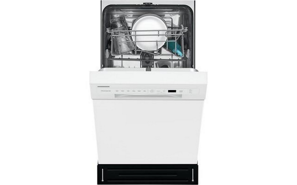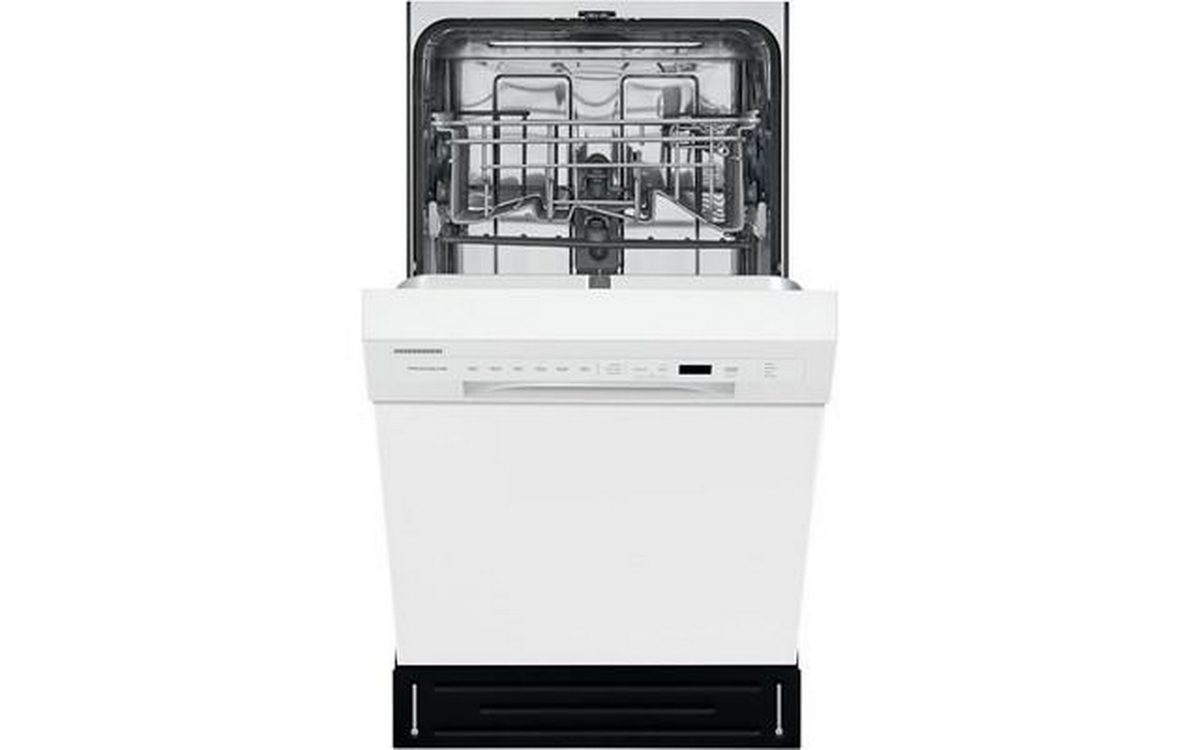 This 18-inch Frigidaire dishwasher features 5 wash speeds, filtration system, 6 wash programs and can accommodate up to 8 place settings. Image shown in stainless steel, model is white.