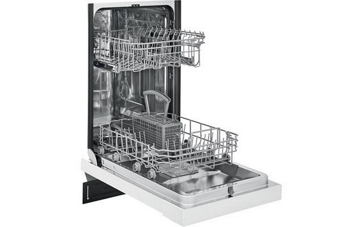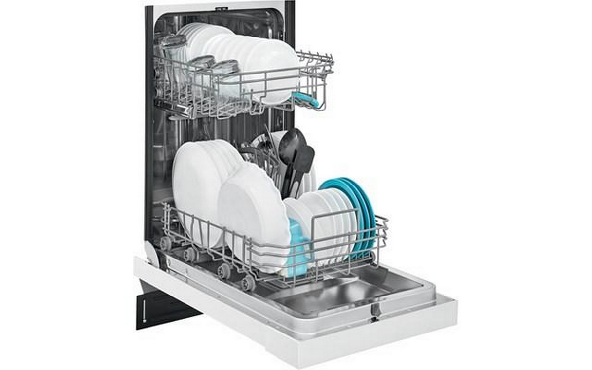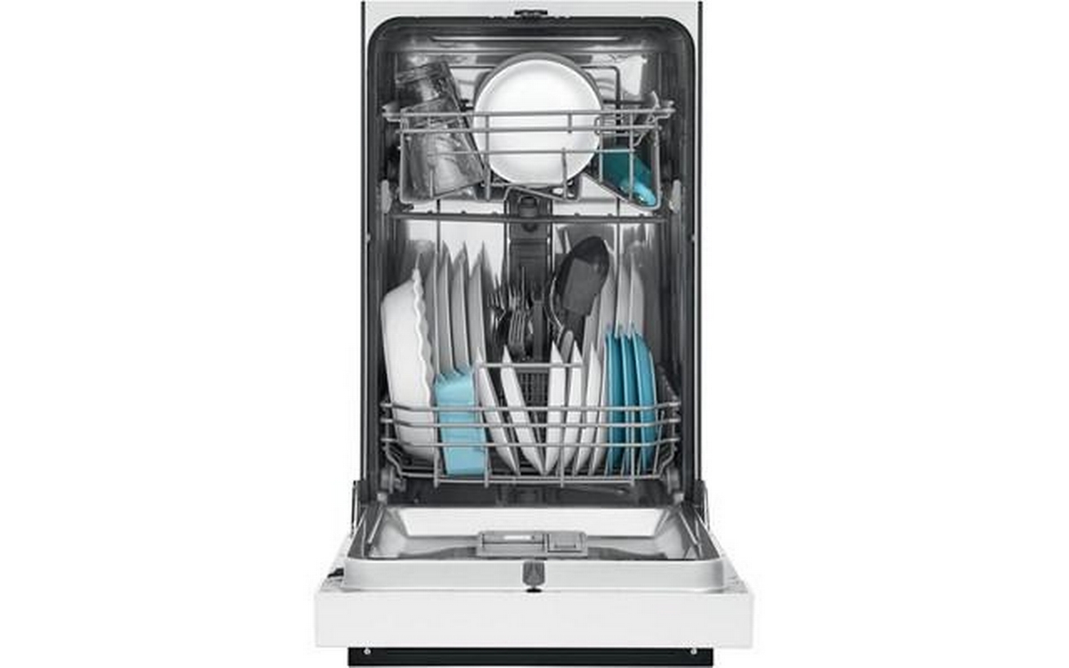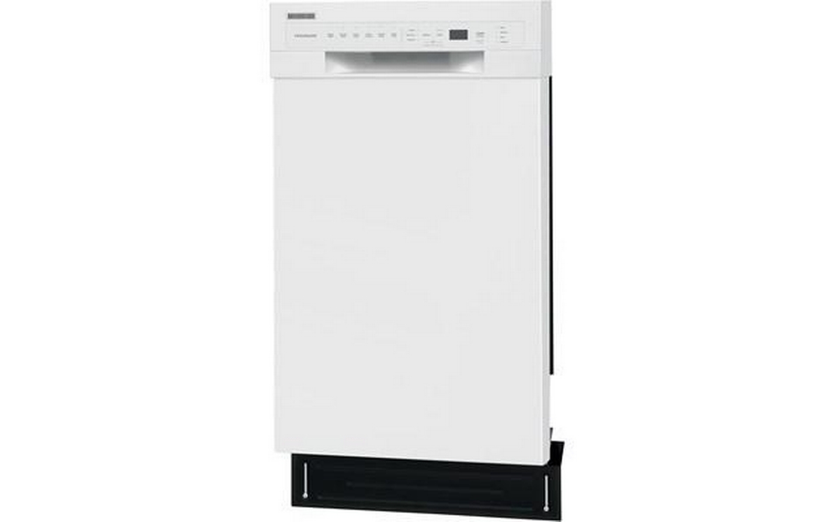 This 18-inch Frigidaire dishwasher features 5 wash speeds, filtration system, 6 wash programs and can accommodate up to 8 place settings. Image shown in stainless steel, model is white.