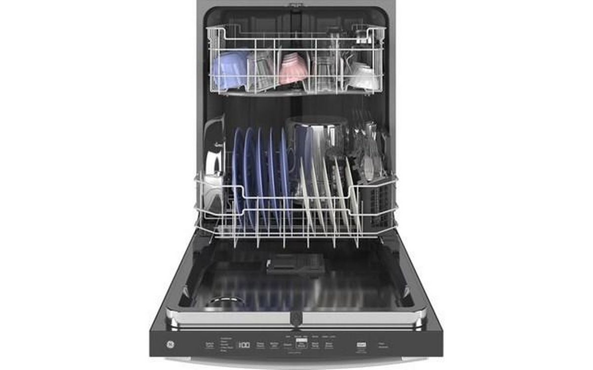 GE top control dishwasher features WiFi powered by SmartHQ™, Dry Boost™ option, bottle jets and can accommodate up to 16 place settings.