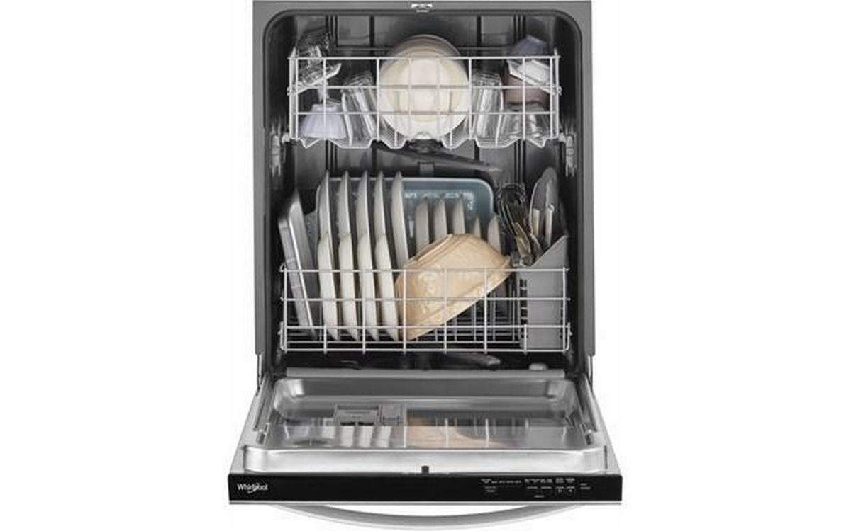 Clean dishes with a 55 dBA quiet dishwasher. Three 5 Cup Shelves free up extra space and a Boost Cycle provides extra effort for cleaning up stubborn messes. This dishwasher includes an Extended Dry Option to elevate drying performance and a Triple Filtration Wash System that filters food particles and cleans the water between wash stages.