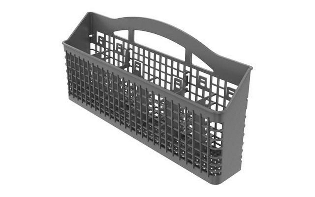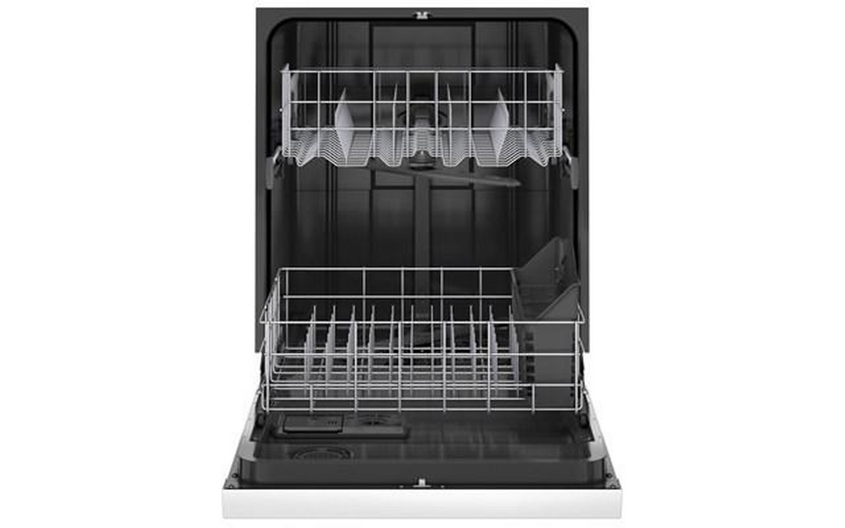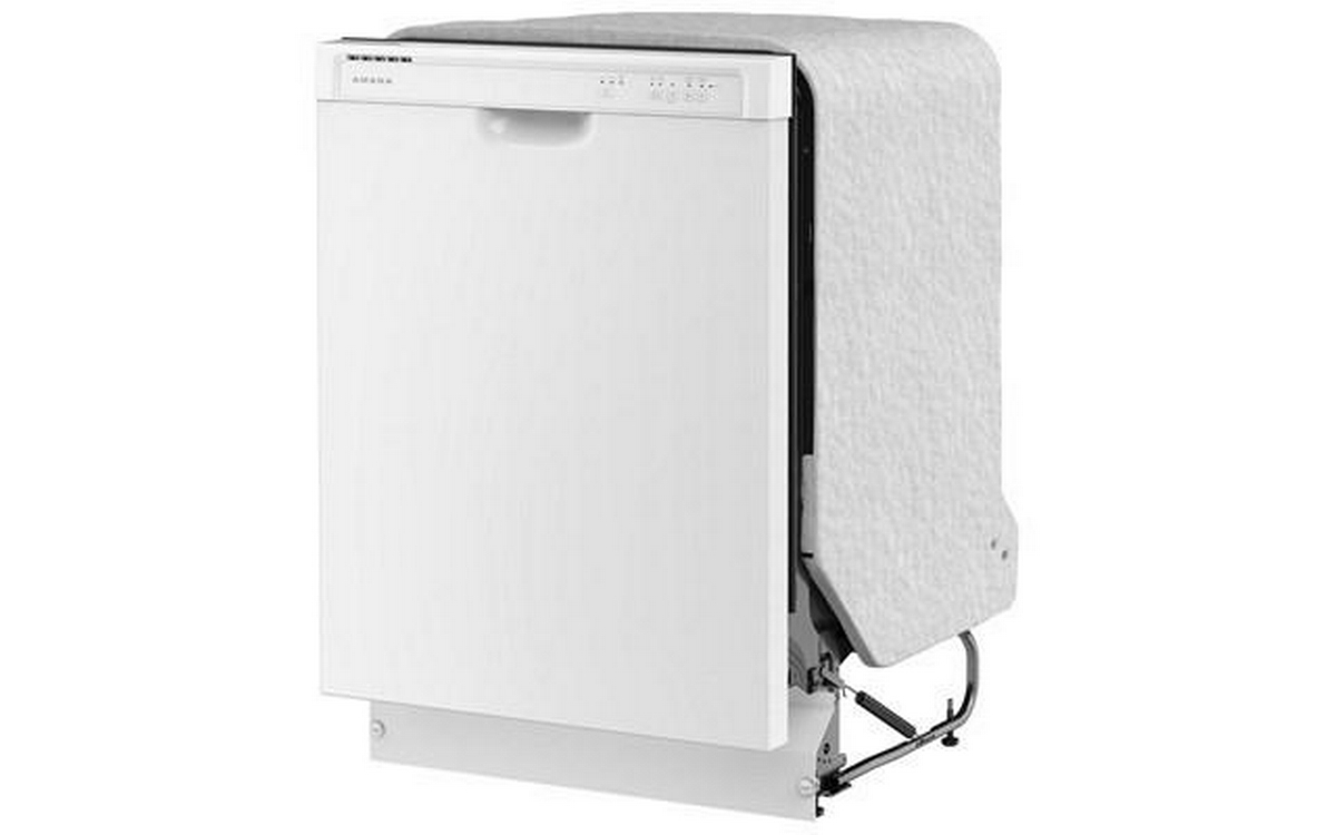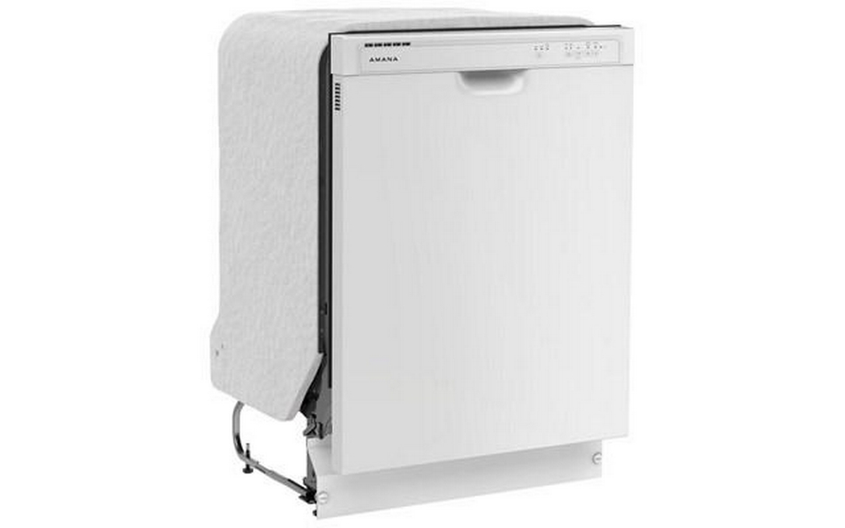 Amana 24-inch front control dishwasher with silverware basket.