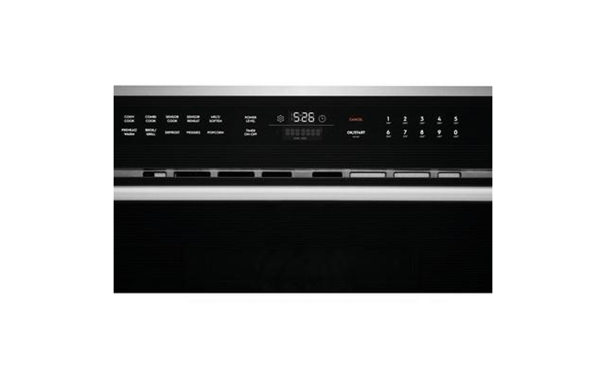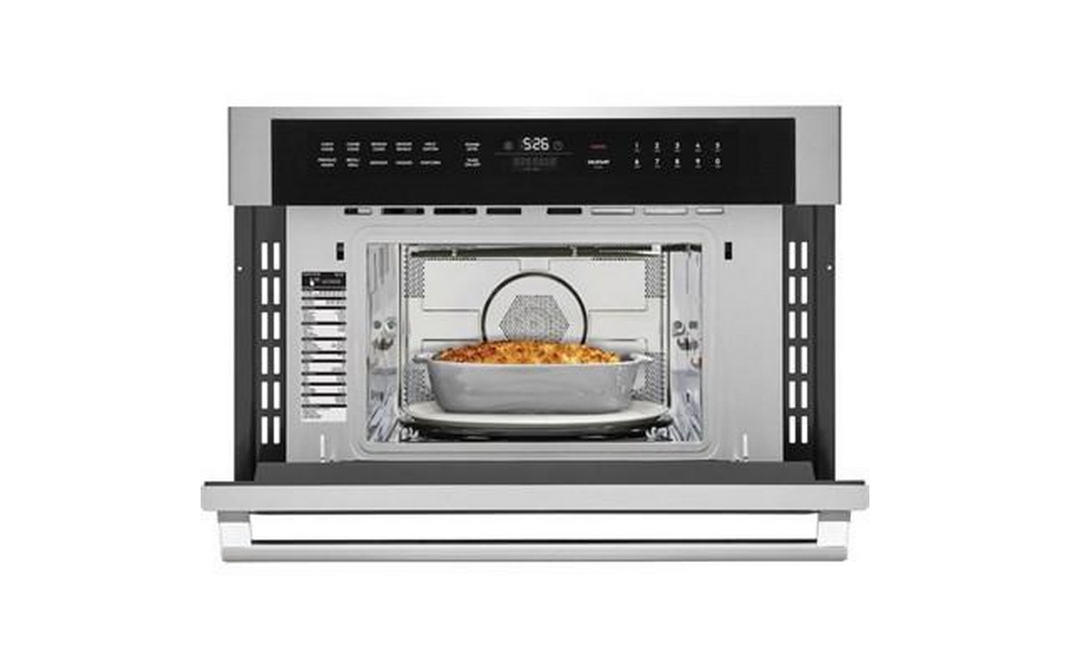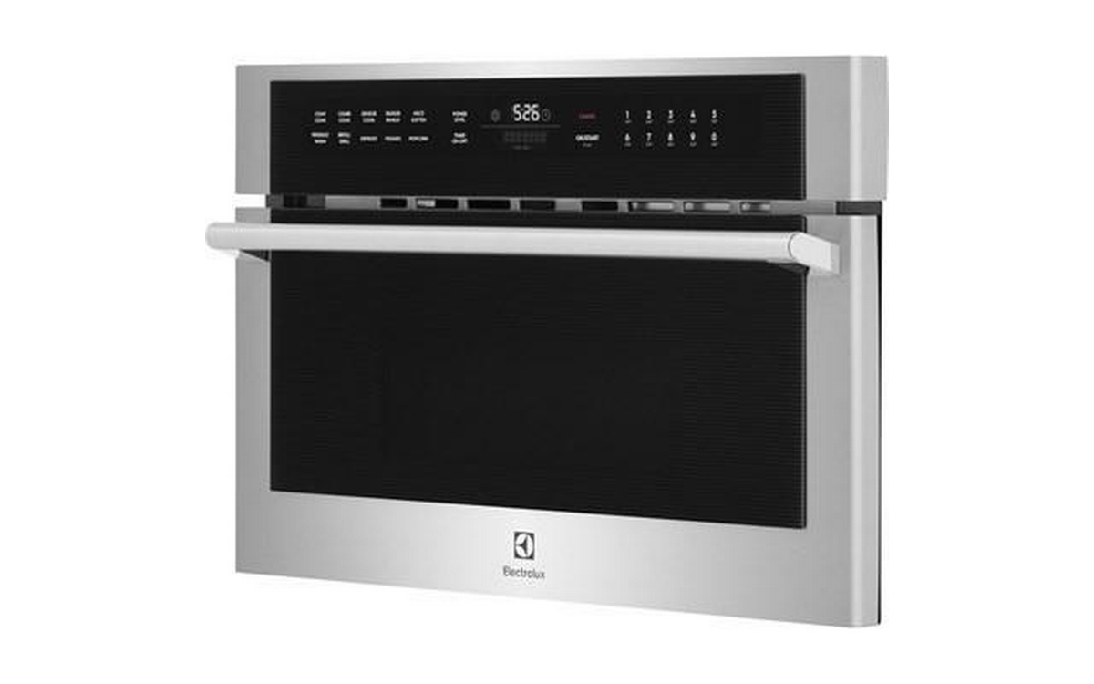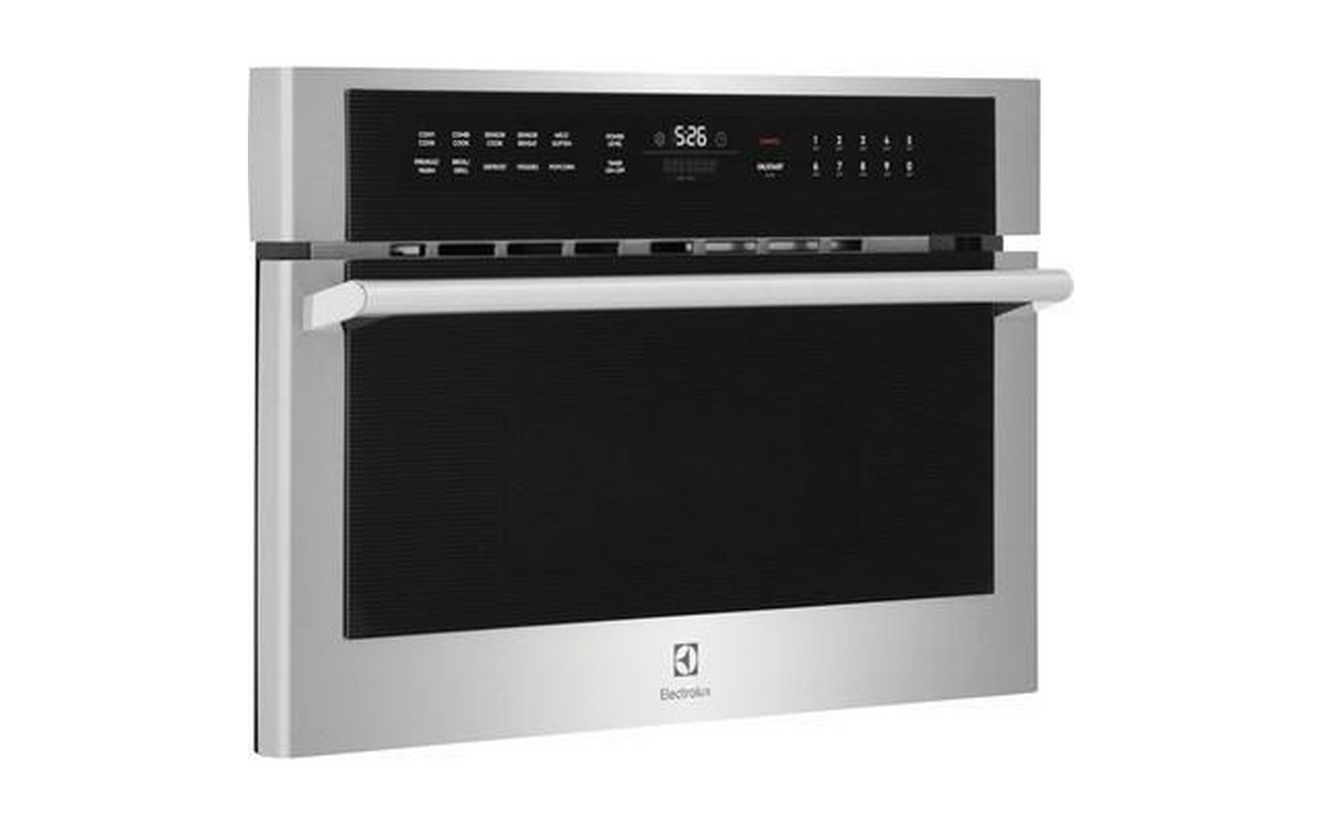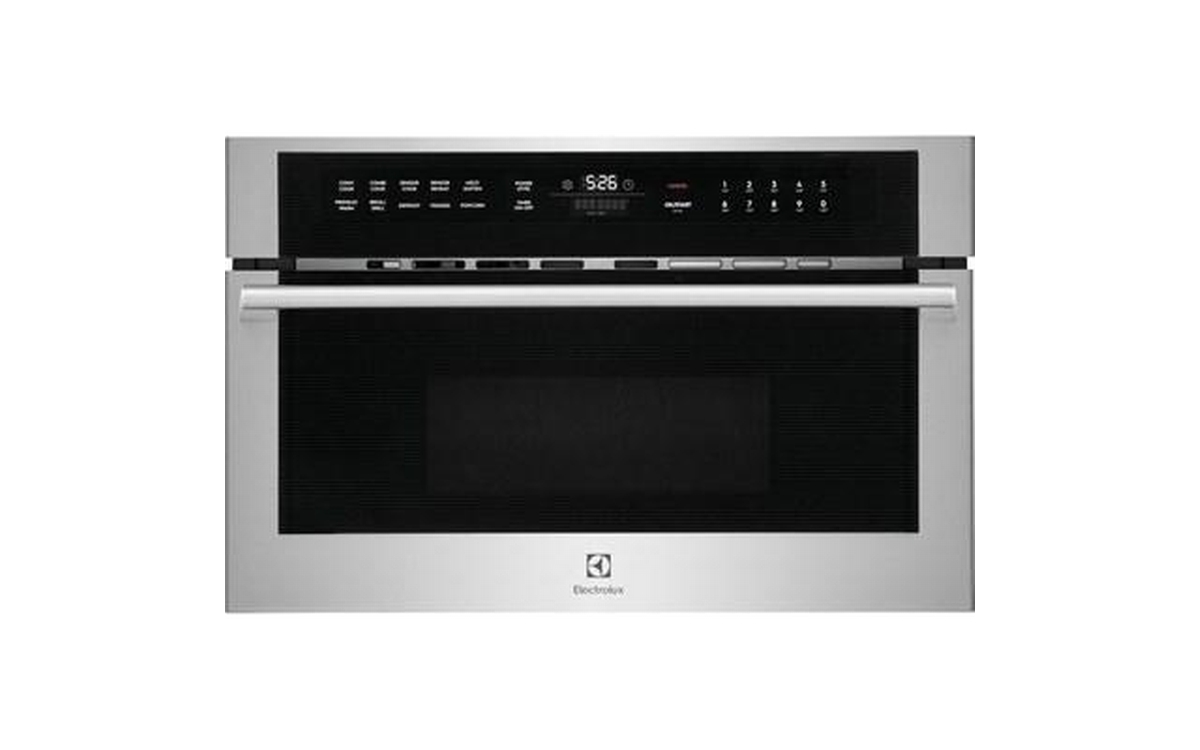 Electrolux 30" built-in microwave oven with drop-down door. The sleek design of this microwave looks beautiful in any kitchen thanks to glass touch controls, a stainless steel handle with gunmetal chrome standoffs and Electrolux's signature pinstripe design.