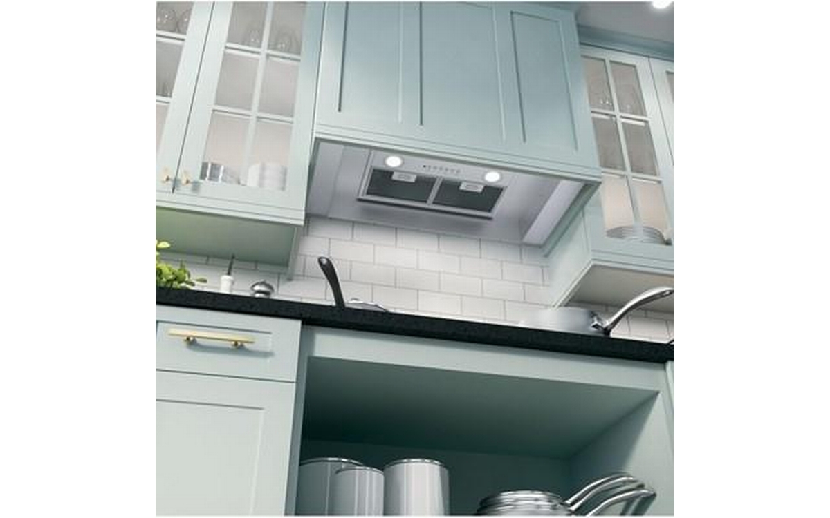 This GE 21" custom hood insert features dimmable LED lighting, 4 speeds and electronic control.