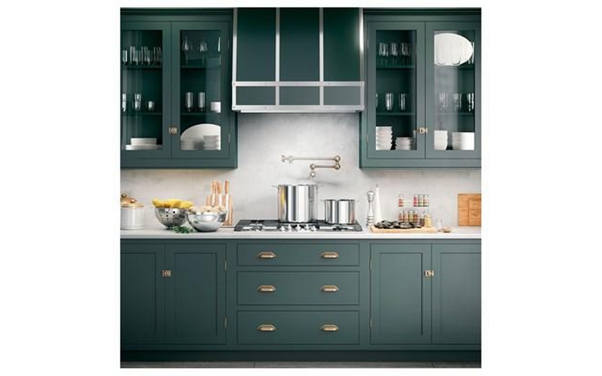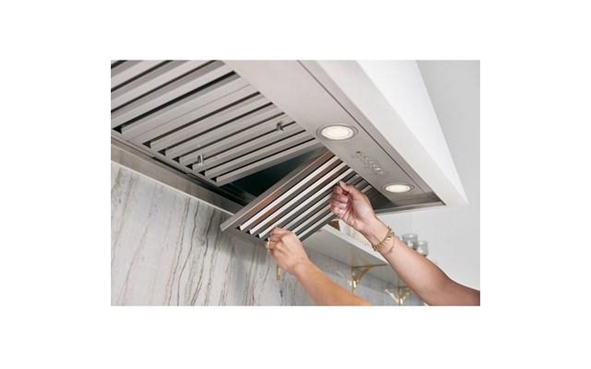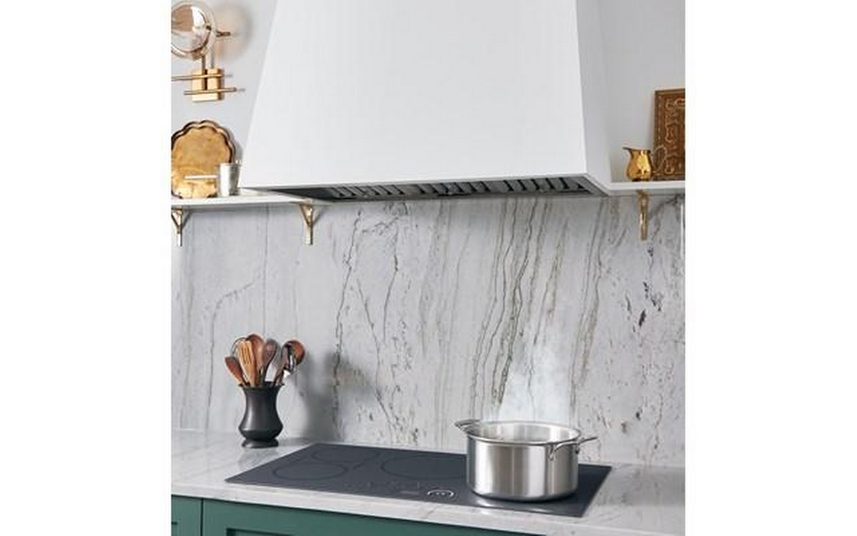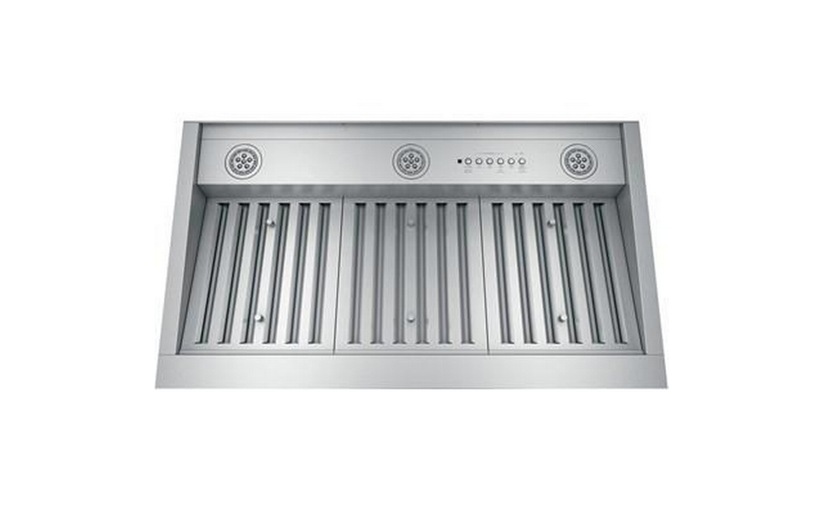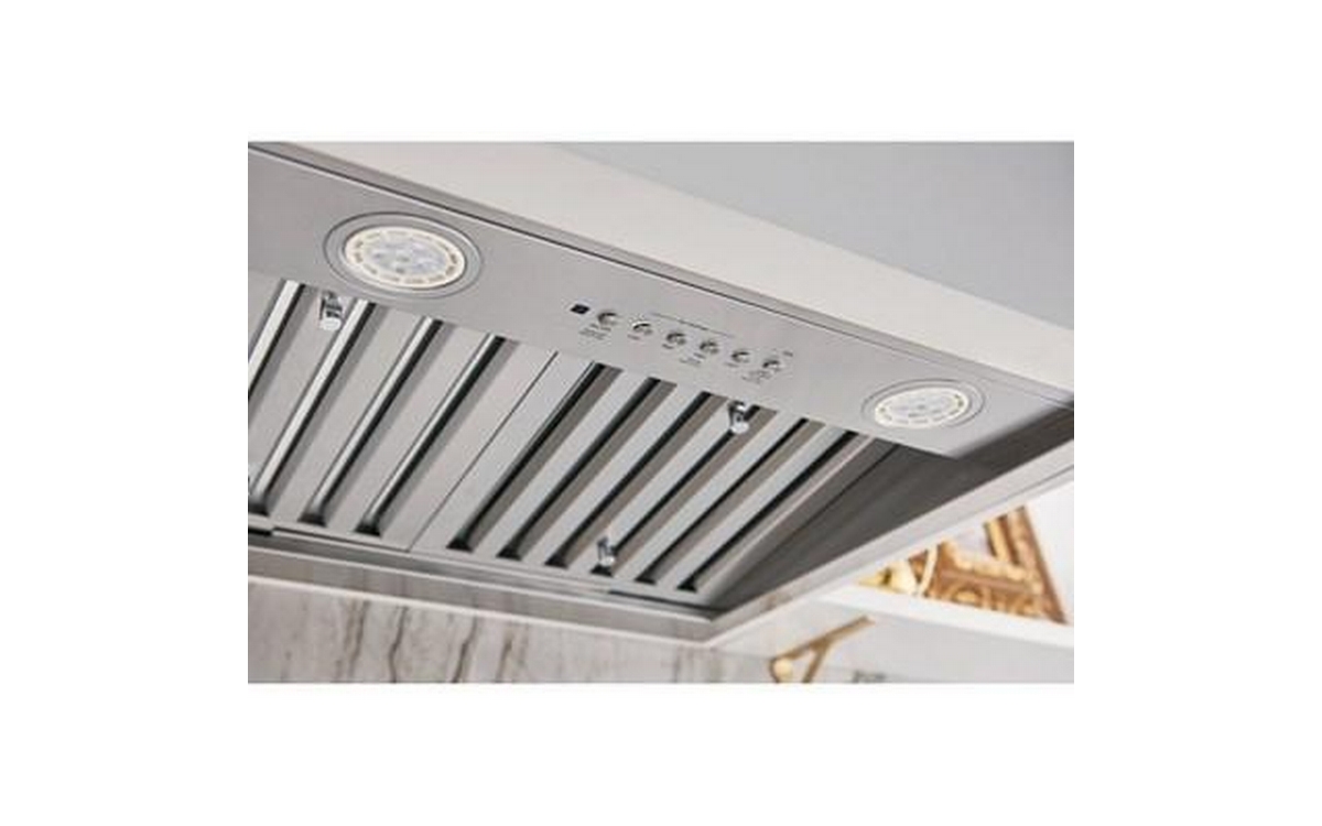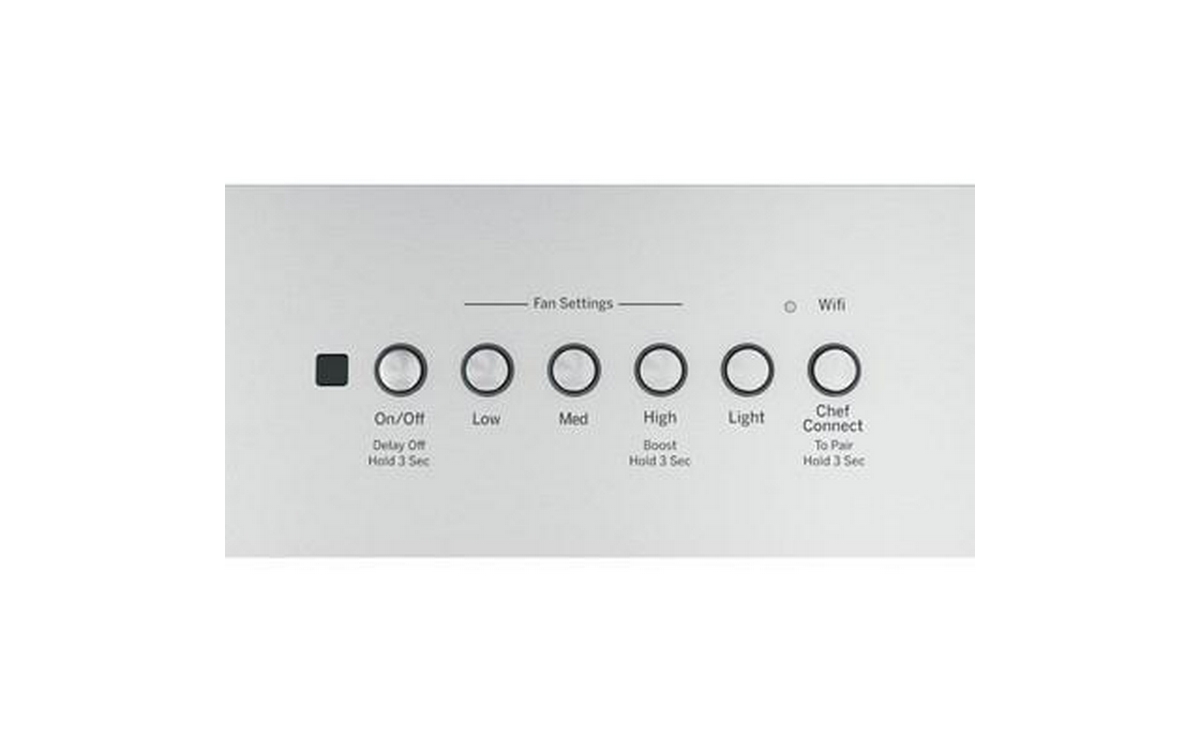 This 36-inch wide GE hood custom insert features dimmable LED lighting, 4-speed vent, charcoal filter, and Wi-Fi connectivity.