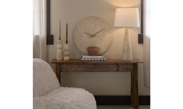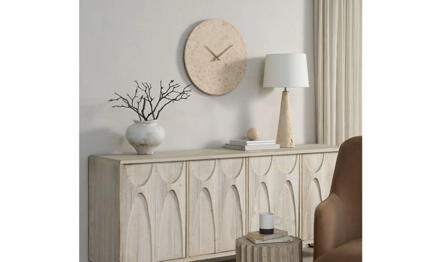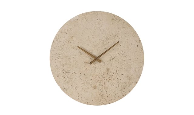 This wall clock uses travertine as a stylish choice for anyone wanting to inject enduring elegance into their space. Marrying fashion and function, its natural stone face, antique brushed brass-plated hands and number-free design are an example of time-telling perfection.