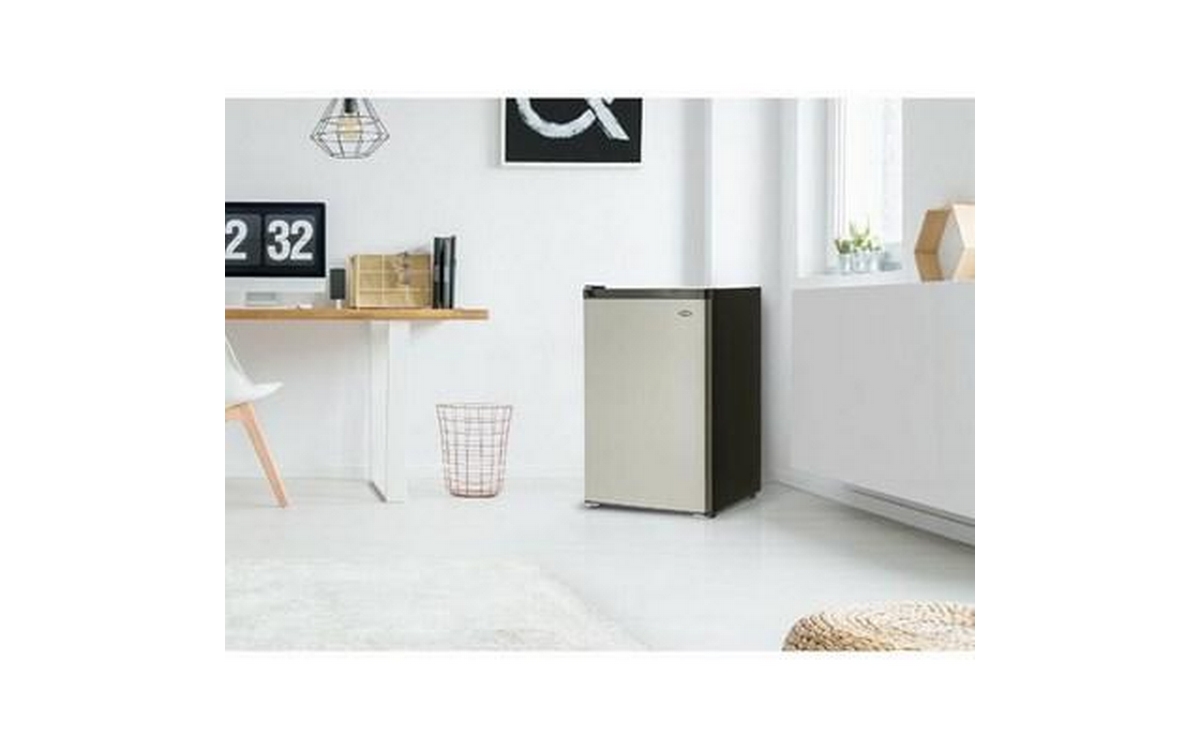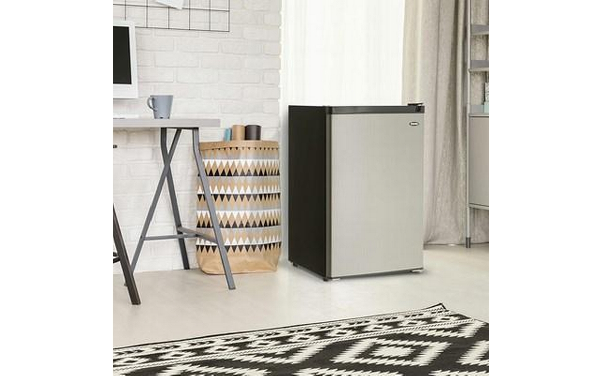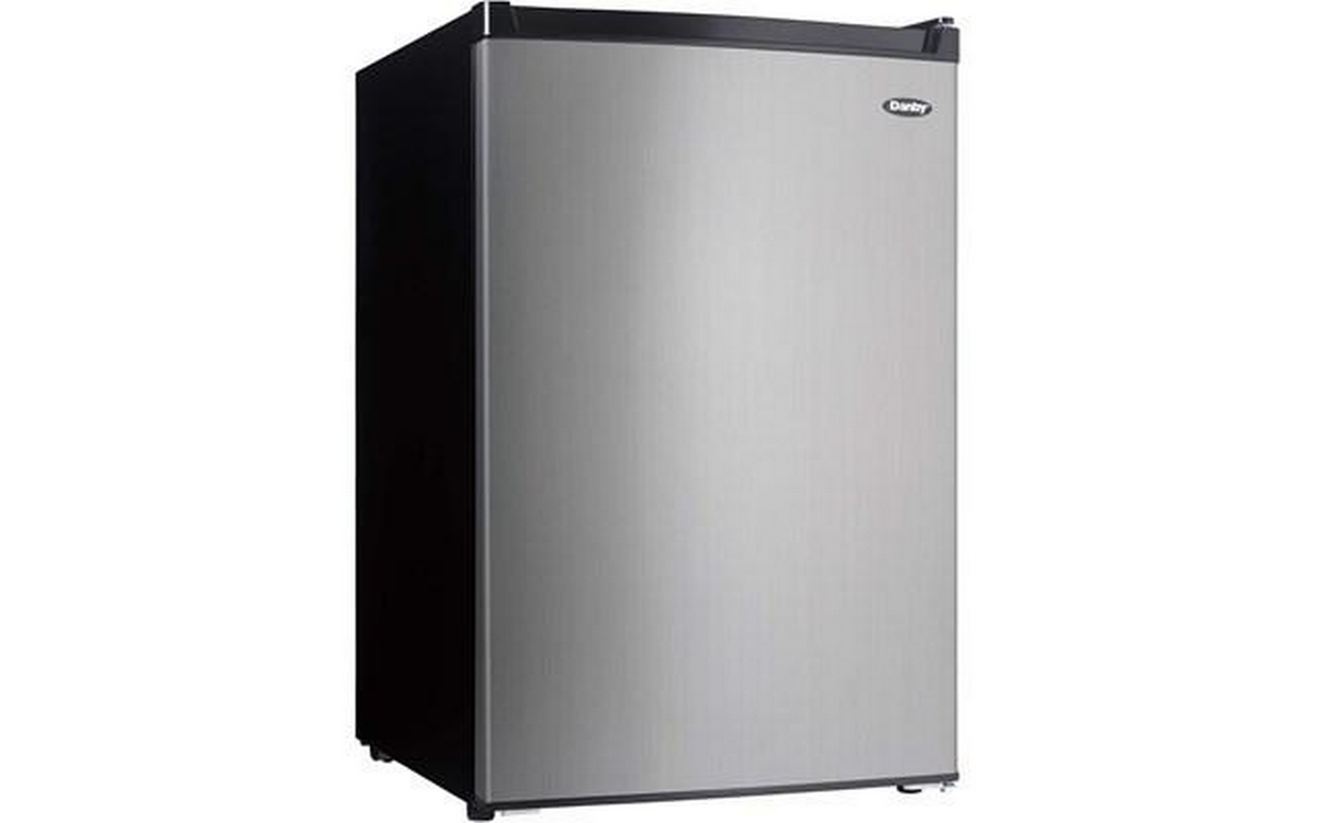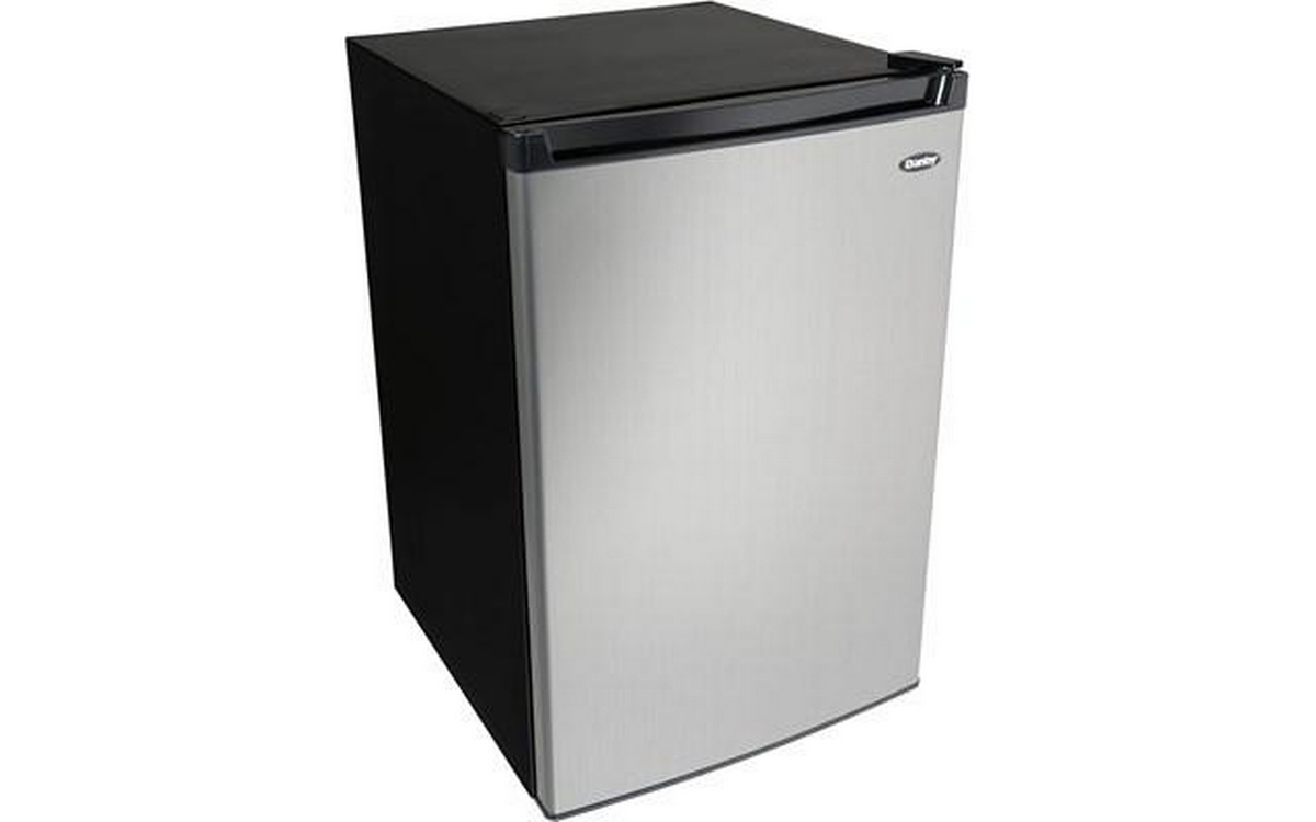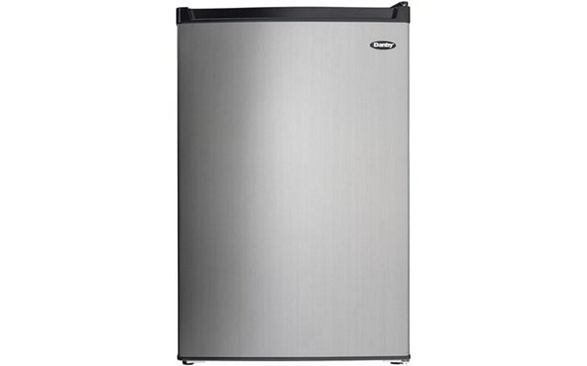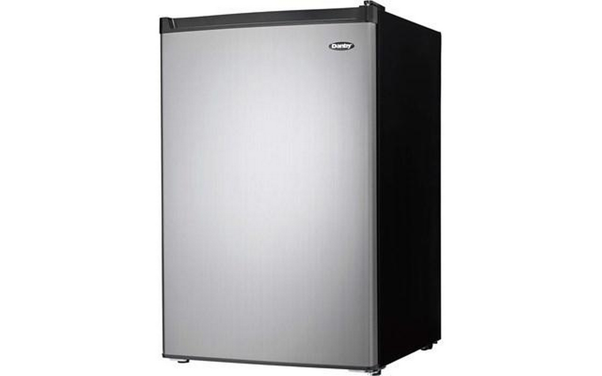Danby 4.5 cu. ft. Compact Refrigerator with True Freezer in Stainless Steel. This compact refrigerator by Danby offers 4.5 cubic feet capacity with a sleek stainless steel finish. It includes a full-width true freezer section (operates at -18°C) to ensure your ice cream and perishables are kept frozen and comes Energy Star rated. The reversible door and smooth-back design allow this unit to fit neatly against a wall or in a corner. And the adjustable glass shelves make clean up easy if spills occur. Perfect for dorms, offices, or rec rooms, this Danby compact refrigerator with true freezer is the ultimate single-door mini fridge.