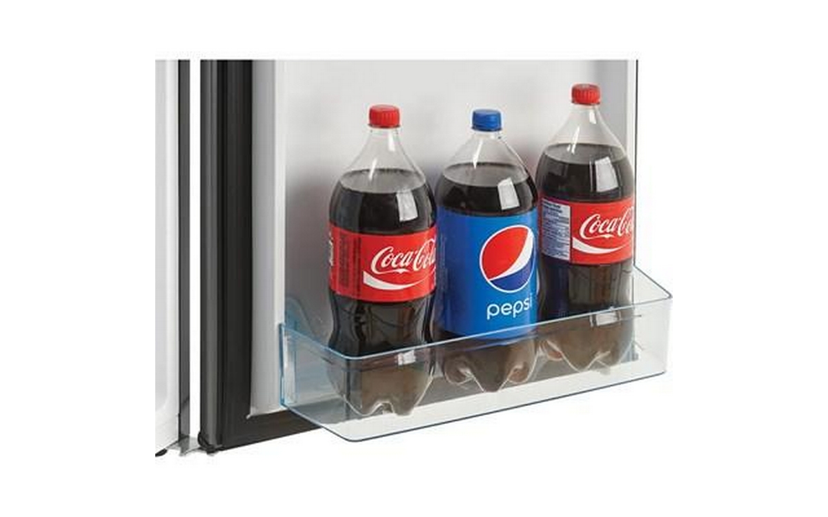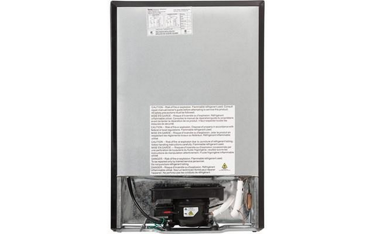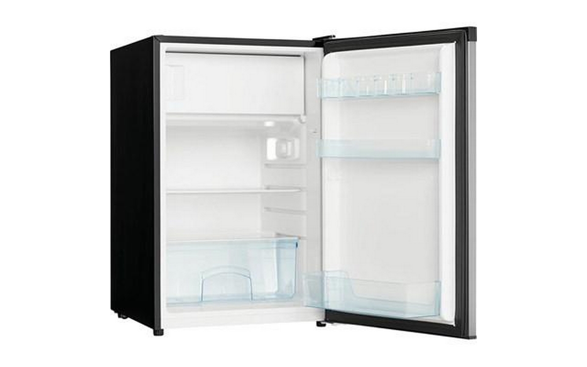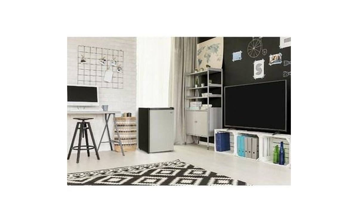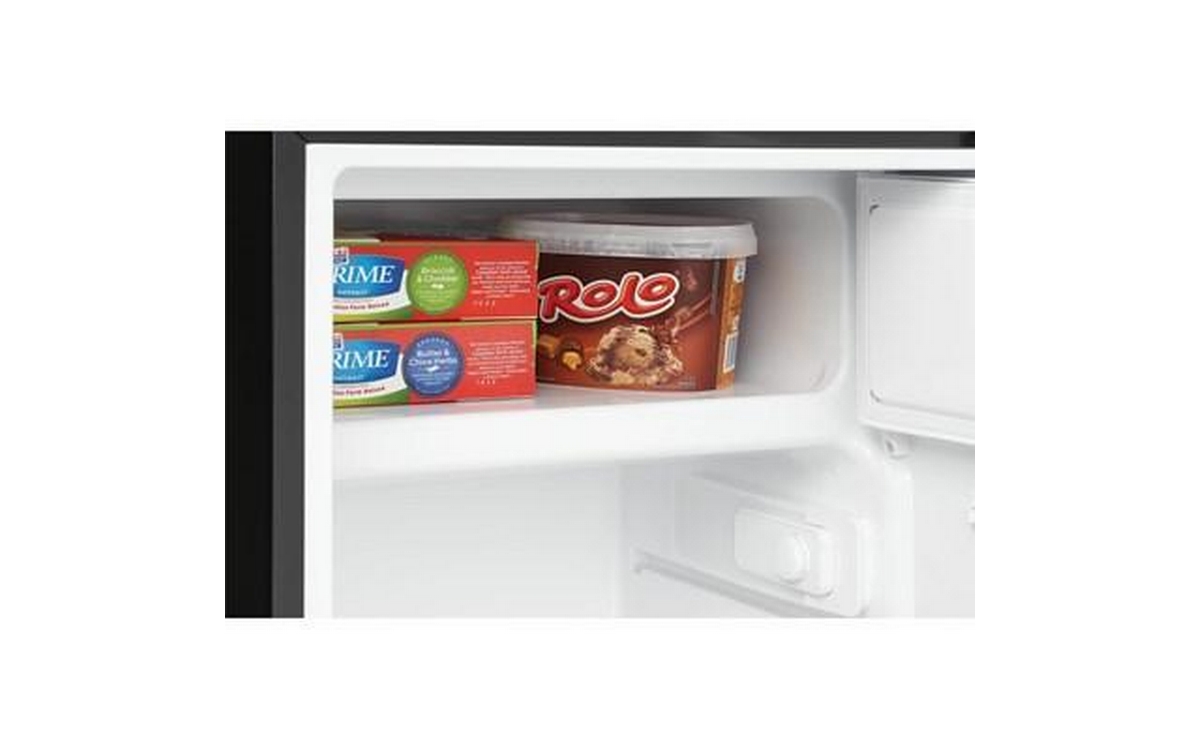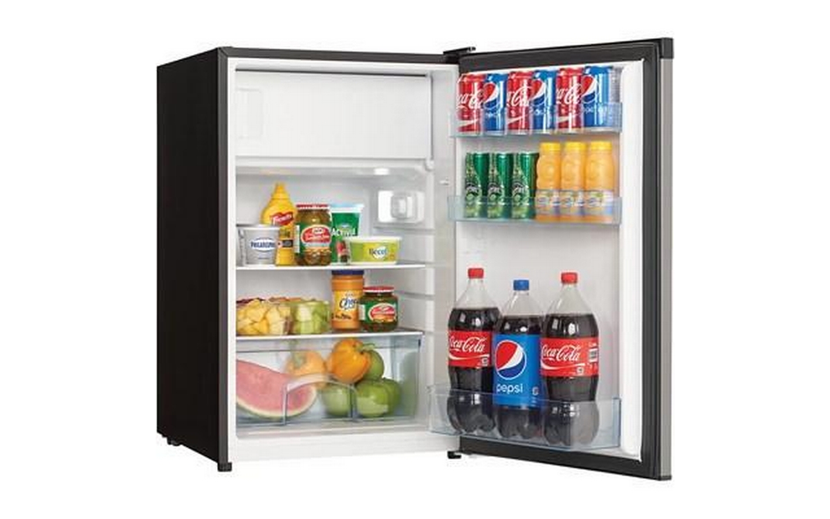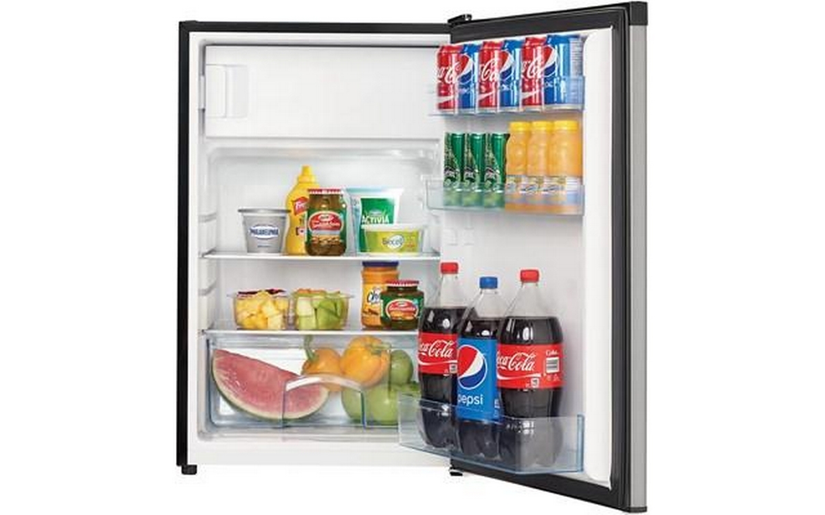 Danby 4.5 cu. ft. Compact Refrigerator with True Freezer in Stainless Steel. This compact refrigerator by Danby offers 4.5 cubic feet capacity with a sleek stainless steel finish. It includes a full-width true freezer section (operates at -18°C) to ensure your ice cream and perishables are kept frozen and comes Energy Star rated. The reversible door and smooth-back design allow this unit to fit neatly against a wall or in a corner. And the adjustable glass shelves make clean up easy if spills occur. Perfect for dorms, offices, or rec rooms, this Danby compact refrigerator with true freezer is the ultimate single-door mini fridge.