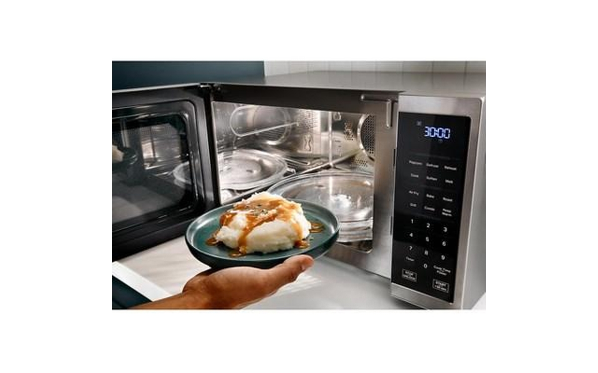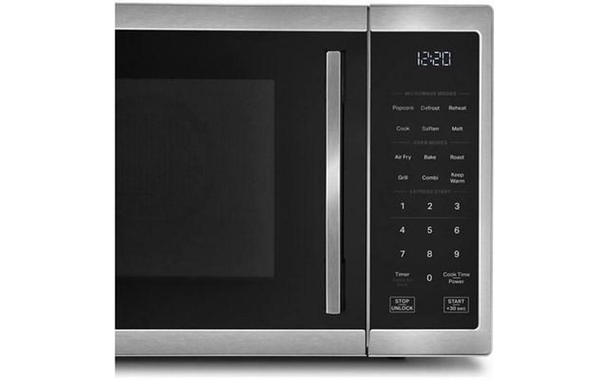 This Whirlpool 900 watt countertop microwave oven puts versatility first with All in One cooking modes including Air Fry, Grill Mode, Roast Mode and Combi. Its modern easy-to-use design and 1.0 ft. capacity fits most meals while not taking up too much countertop space, and its Dishwasher-Safe Turntable Plate makes for easy cleanup.