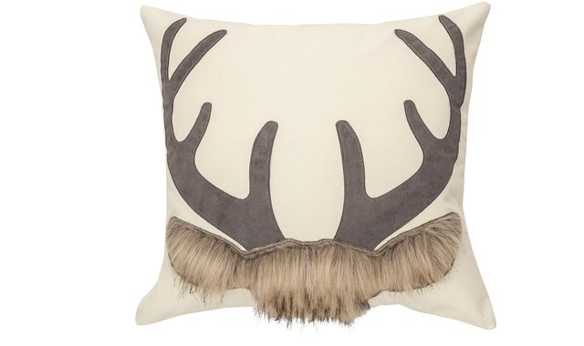 Cream cushion with grey suede deer antlers Size: 18' x 18' Grey suede deer antlers with a touch of faux fur Cotton cover Polyester filler Zipper closure Machine washable cover