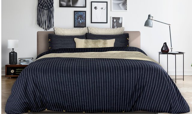 60in duvet cover and 2 pillowcases, 55% linen, 45% cotton, lined navy color.