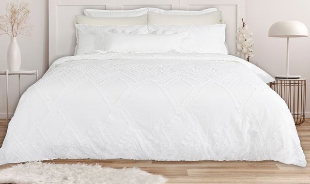 60in duvet cover and 2 pillowcases, 100% cotton, 220 thread count, white with pattern.