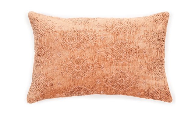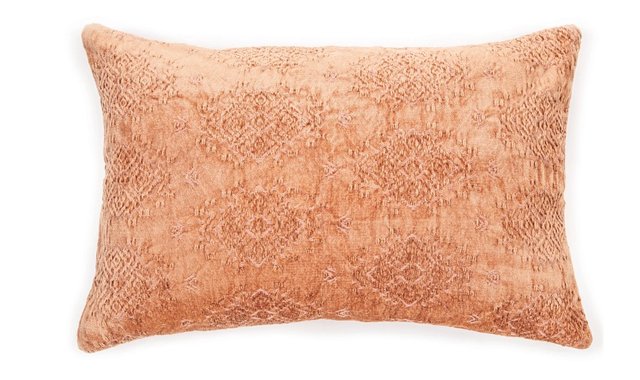 Cushion with terracota velvet effect pattern on the front, 16 ' x 24 ', cover 80% viscose 20% cotton, equipped with a zipper, polyester fill with washable and machine-dry cover.