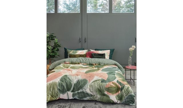 60in duvet cover and 2 pillowcases, 100% cotton with guacamole green and pink foliage pattern. Equipped with a zipper. Machine washable and dryable.