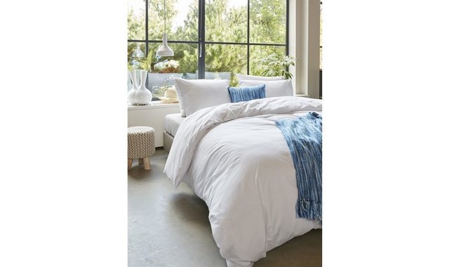 60in duvet cover and 2 pillowcases, 100% plain white cotton. Equipped with a zipper. Machine washable and dryable.